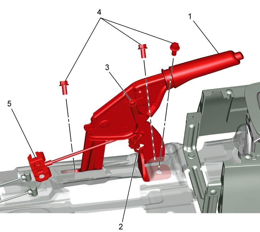 5) Remove parking brake lever bolts (4) and remove parking brake lever assembly (1) with equalizer (5) from vehicle.