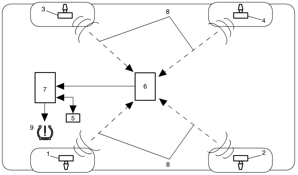 TPMS monitors air pressure in each tire except spare tire. It consists of low tire pressure warning light (9), tire pressure sensors (1) (2) (3) (4), keyless entry / TPMS receiver (6) and keyless start control module (7).