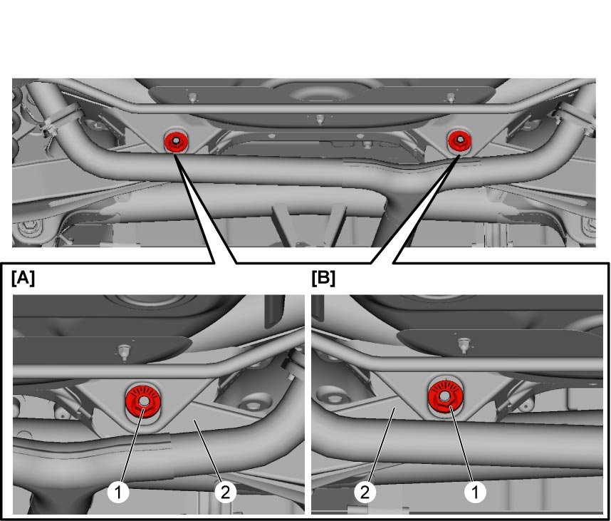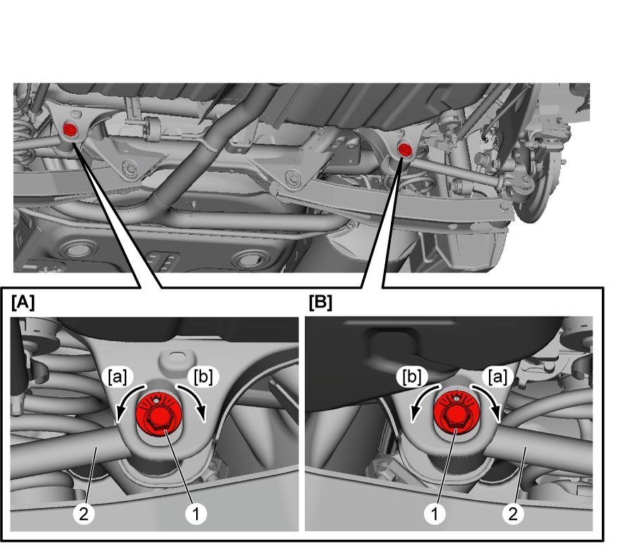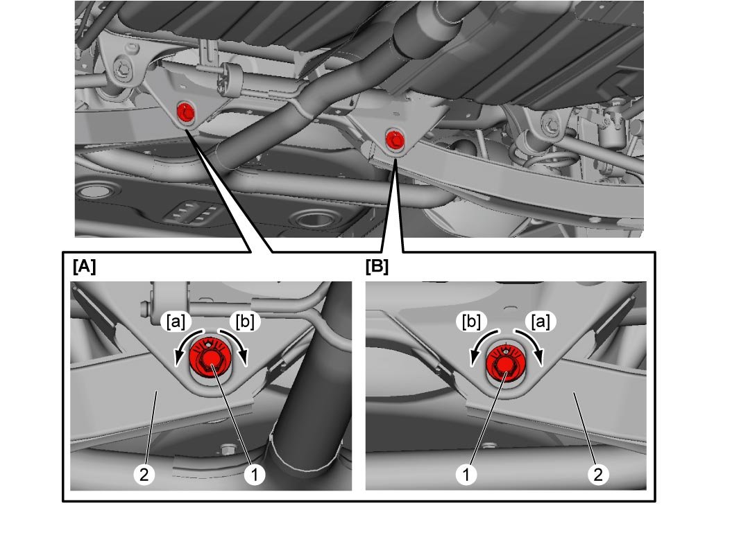 7) Turn lower arm adjustment bolts (1) at right and left by same amount to adjust toe and camber to values in specified ranges.