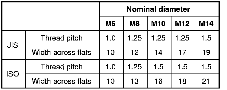 It is important to note that, even when the nominal diameter (1) of the threads is the same, JIS-defined and ISO-defined fasteners may be different in thread pitch (2) or width across flats (3). Refer to the JIS-to-ISO Main Fasteners Comparison Table below for these differences. Before installing a fastener, check it for correct thread pitch and then, screw it in or on the mating fastener by hand. If the fastener is too tight to turn by hand, its thread pitch may be different from that of the mating fastener.