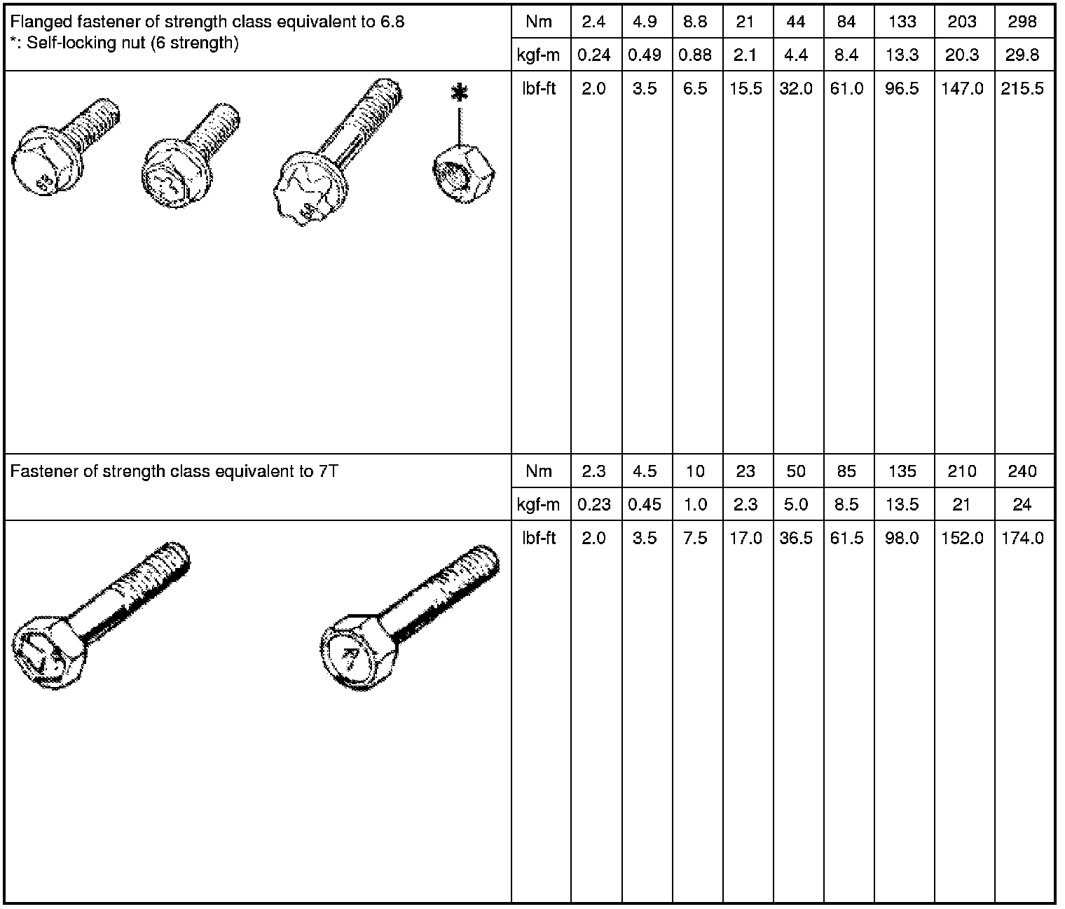 - For flanged bolts, flanged nuts and self-locking nuts of the 4T and 7T strength classes, add 10% to the applicable tightening torques given in the following chart.