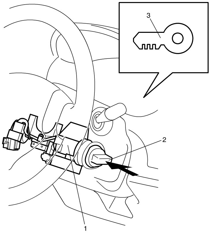 Push the ignition knob switch (2) of the steering lock unit (1) and check that the key indicator light (3) in the combination meter lights up in red or blue. If it does not light, go to Key Indicator Light Circuit Check (Key Indicator Light Does Not Light when Ignition Knob Switch Is Pushed) Key Indicator Light Circuit Check (Key Indicator Light Does Not Light when Ignition Knob Switch Is Pushed).