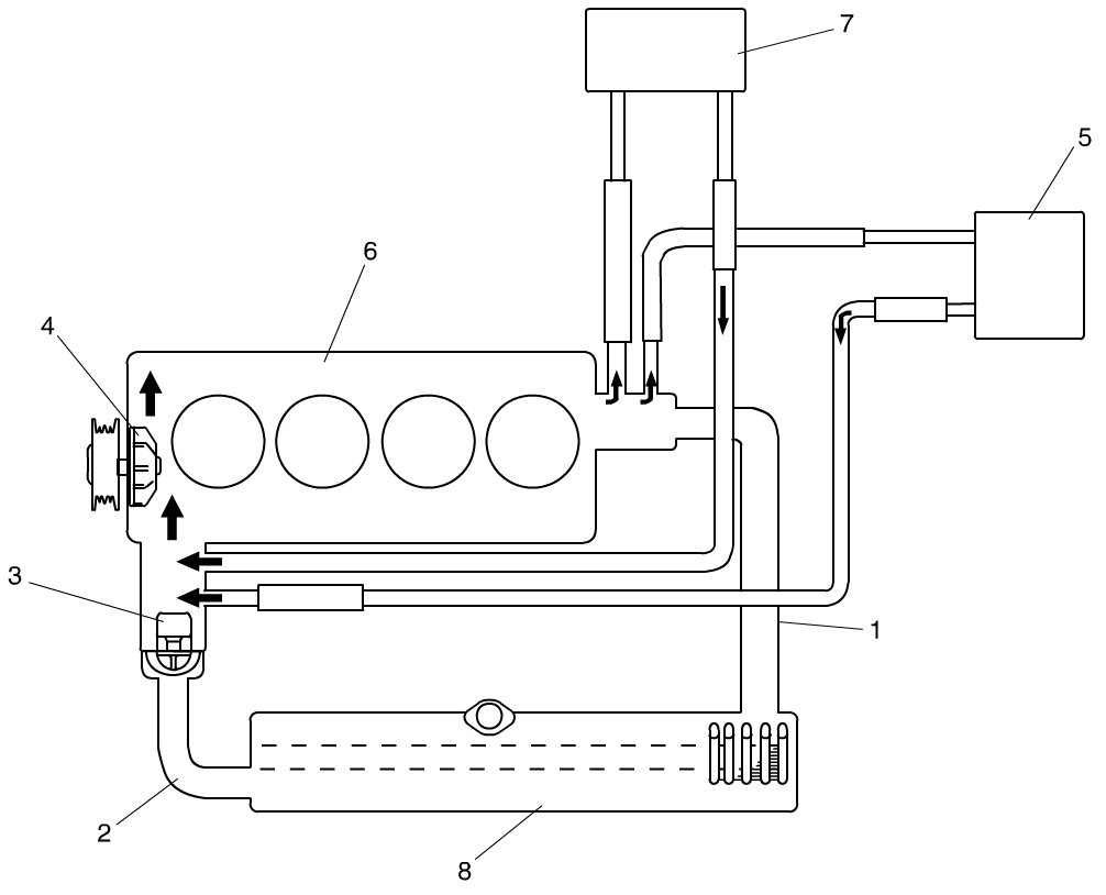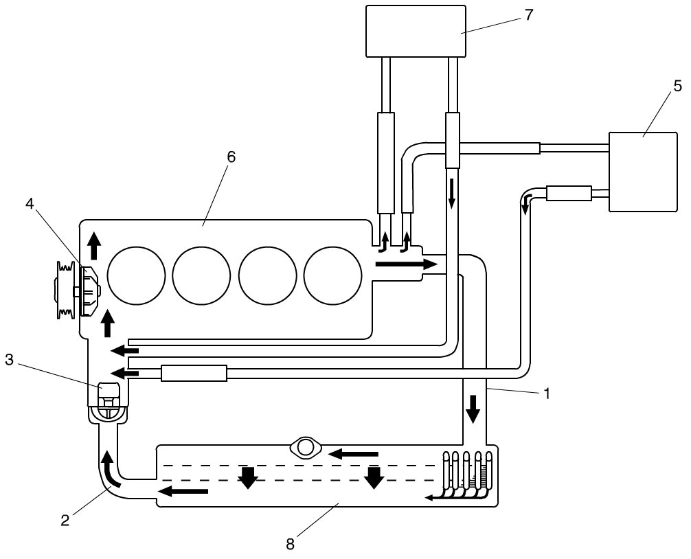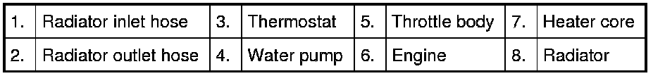 While the engine is warmed up (thermostat closed), coolant circulates as follows.