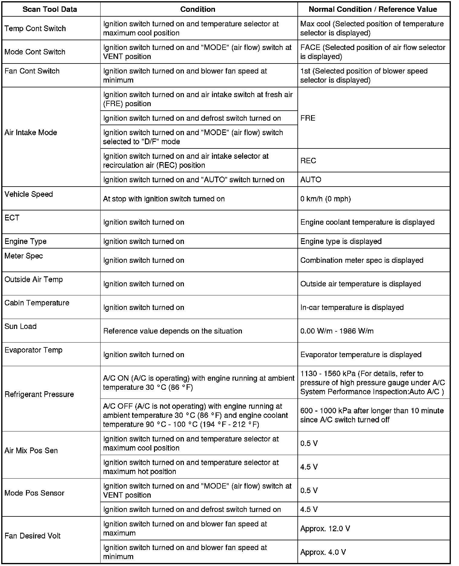 As the data values given in the following are standard values estimated on the basis of values obtained from the normally operation vehicles by using a scan tool, use them as reference values. Even when the vehicles are in good condition, there may be cases where the checked values do not fall within each specifies data range. Therefore, judgement as abnormal should not be made by checking with these data alone.