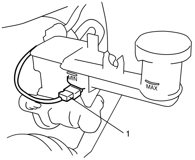 Check for continuity between terminals of brake fluid level switch coupler (1). If found defective, replace switch.