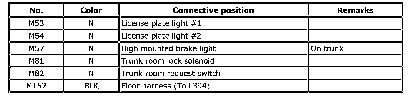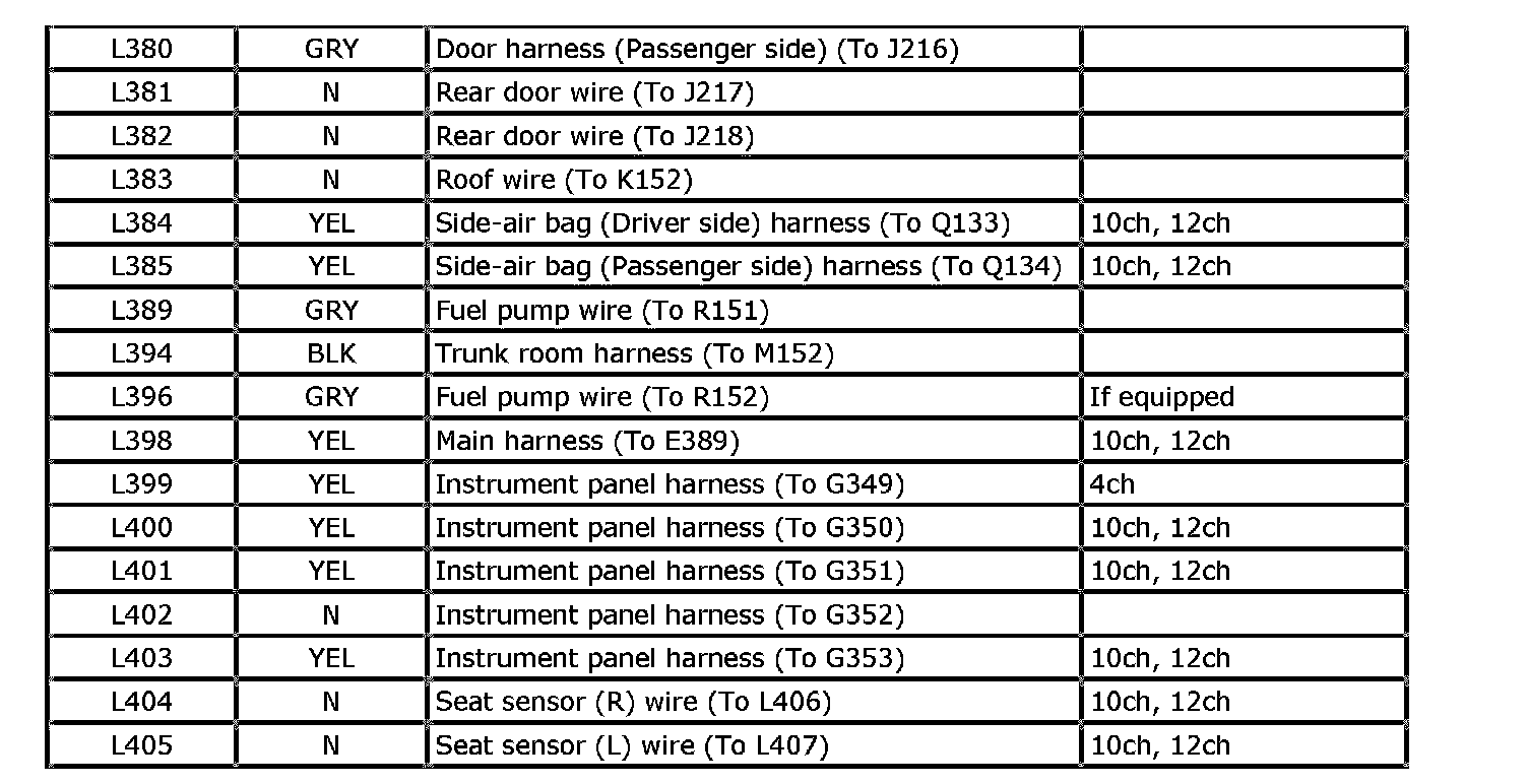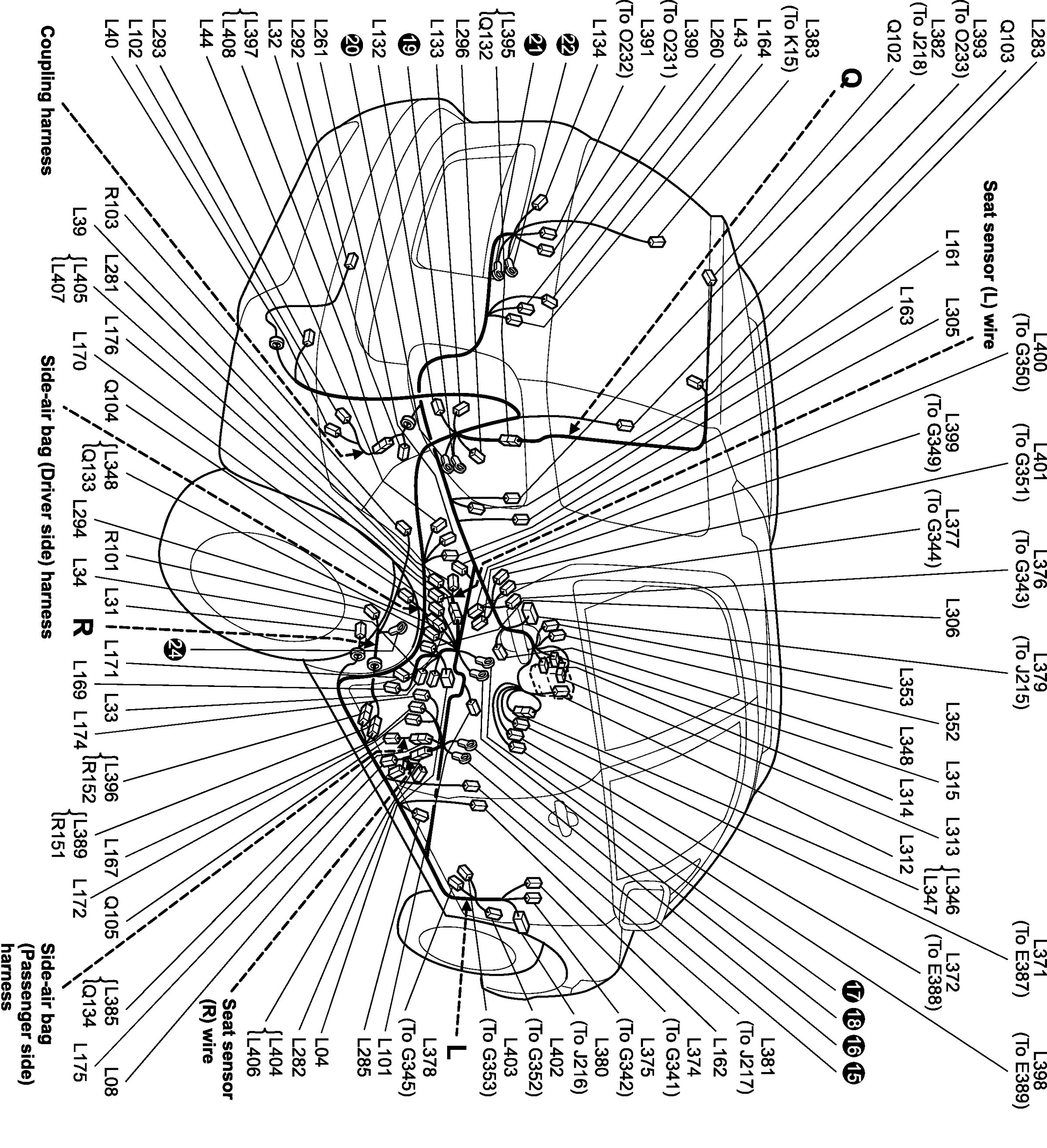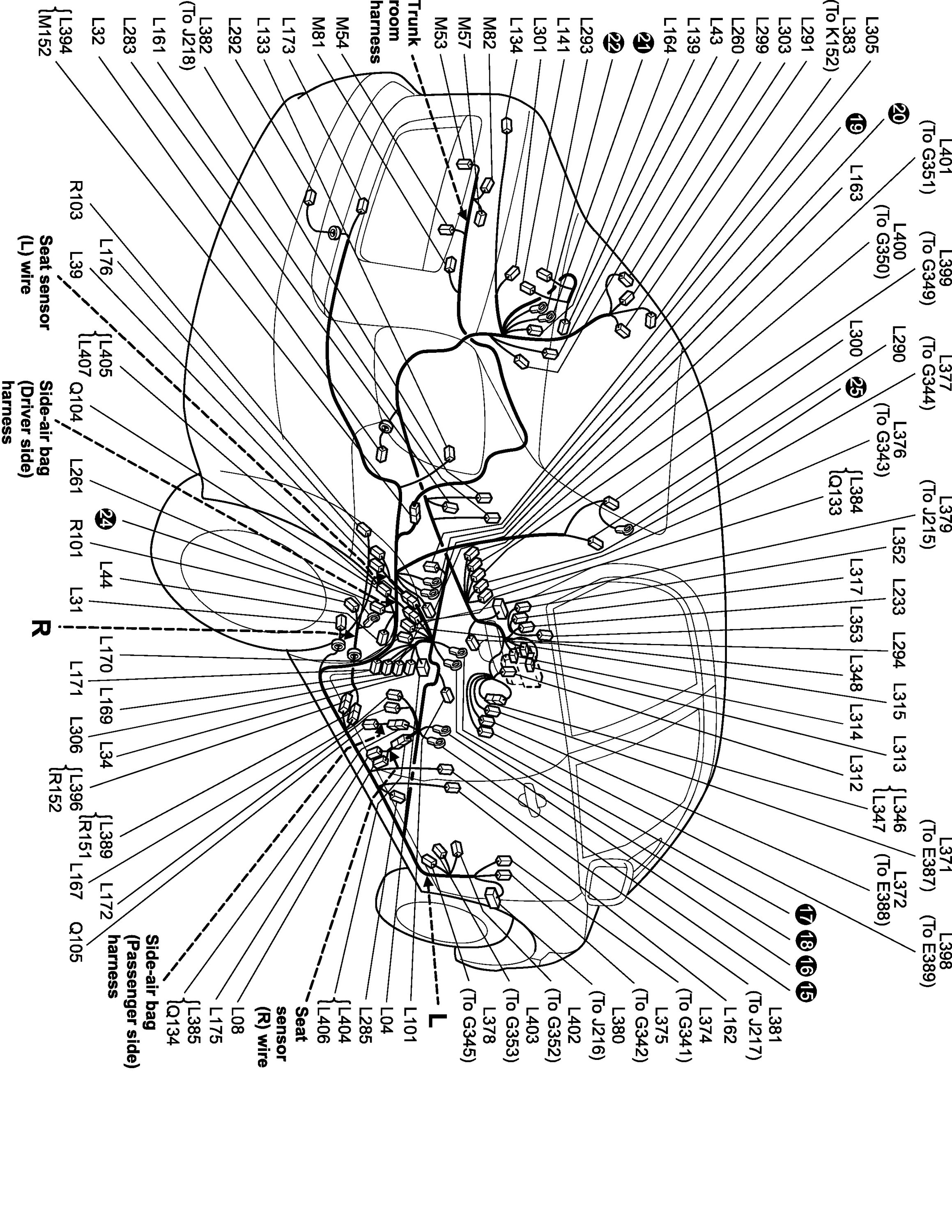 L: Floor Harness, Seat Sensor (R) Wire, Seat Sensor (L) Wire / M: Trunk Room Harness / Q: Side-Air Bag (Driver Side) Harness, Side-Air Bag (Passenger Side) Harness / R: Fuel Pump Wire (Sedan)