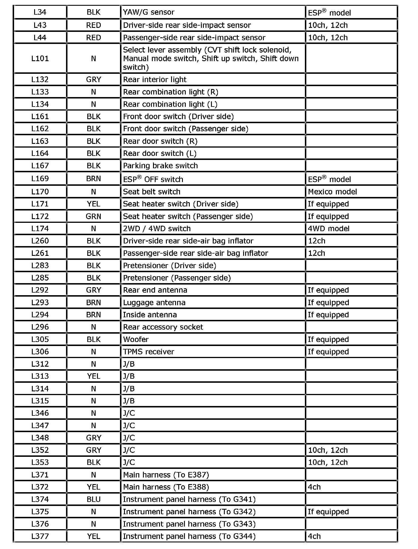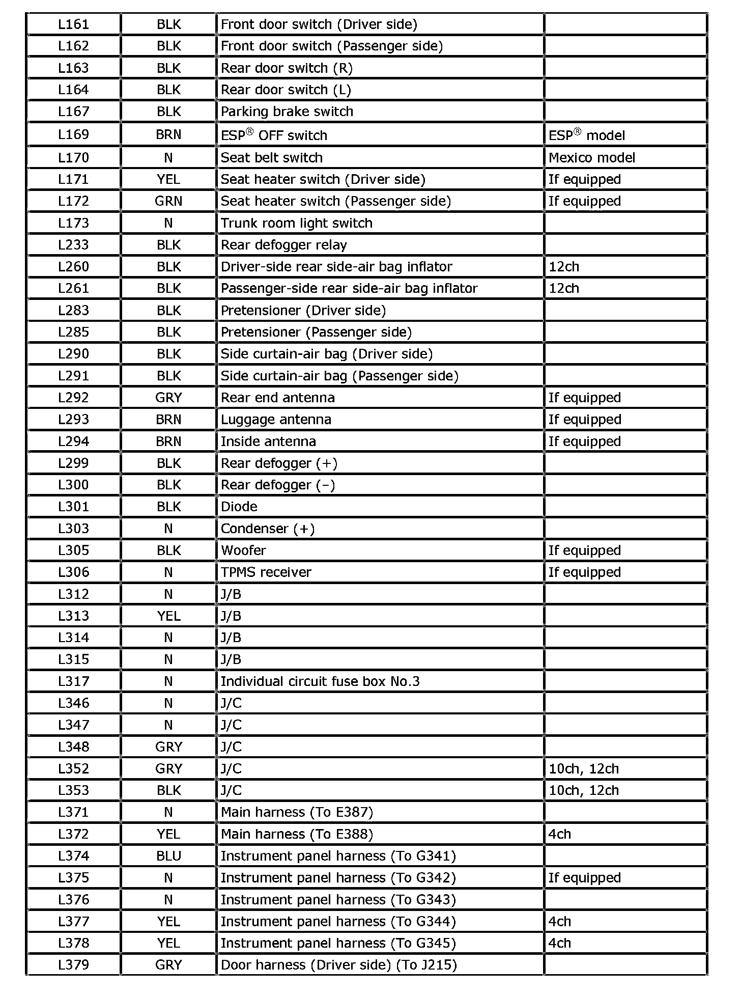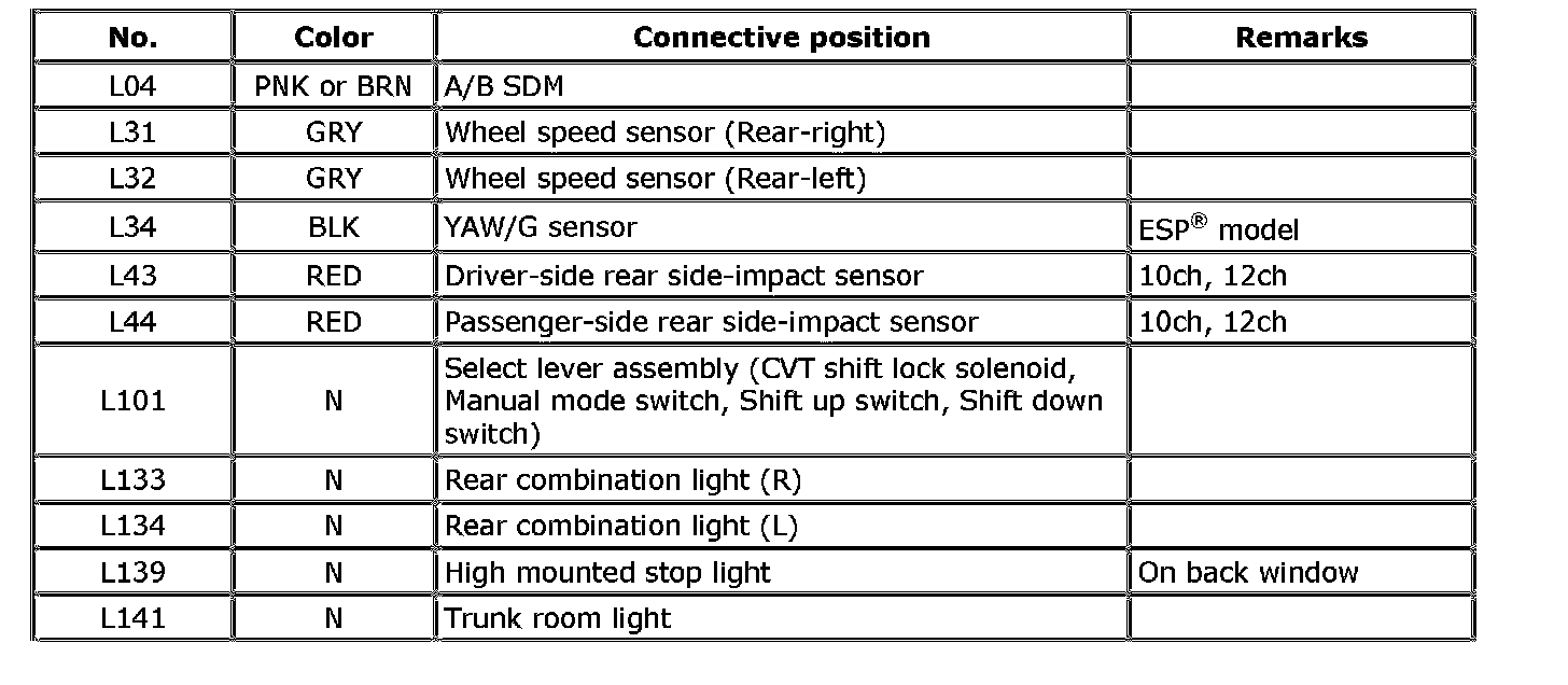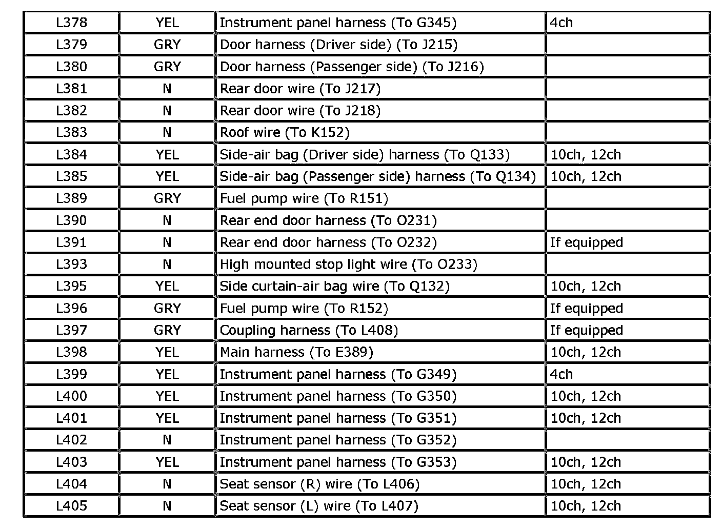 L: Floor Harness, Seat Sensor (R) Wire, Seat Sensor (L) Wire / M: Trunk Room Harness / Q: Side-Air Bag (Driver Side) Harness, Side-Air Bag (Passenger Side) Harness / R: Fuel Pump Wire (Sedan)
