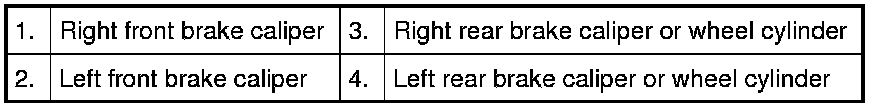 Perform bleeding operation starting with rear brake caliper or wheel cylinder farthest from master cylinder and then at front caliper of the same brake line. Do the same on the other brake line.