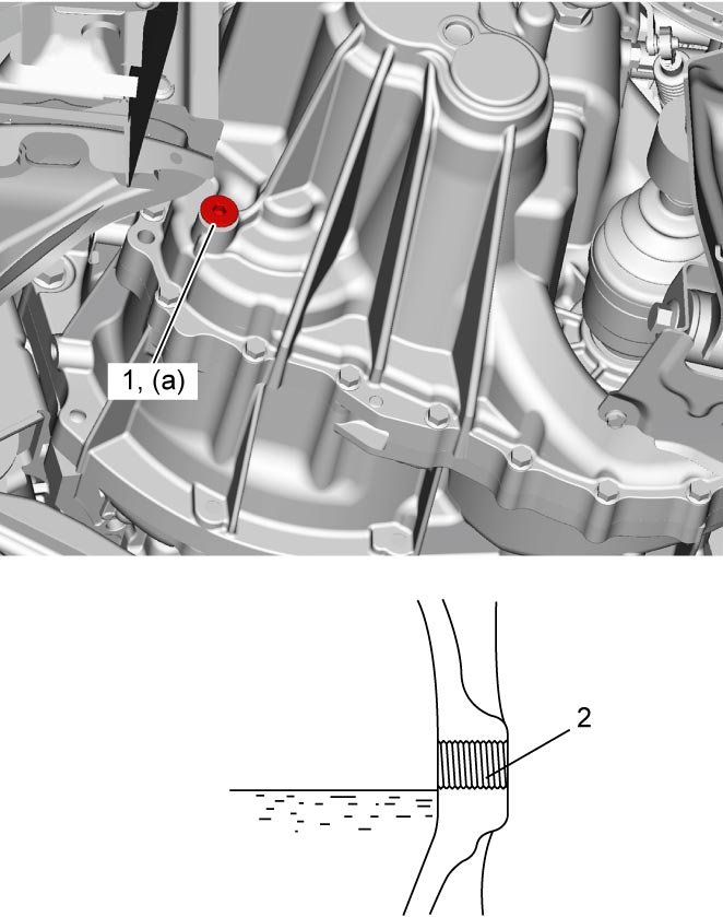 3) Remove transaxle oil level / filler plug (1) and gasket, and confirm oil flow from oil level / filler plug hole (2). If oil does not flow, pour specified oil until a little oil flow from oil level / filler plug hole.