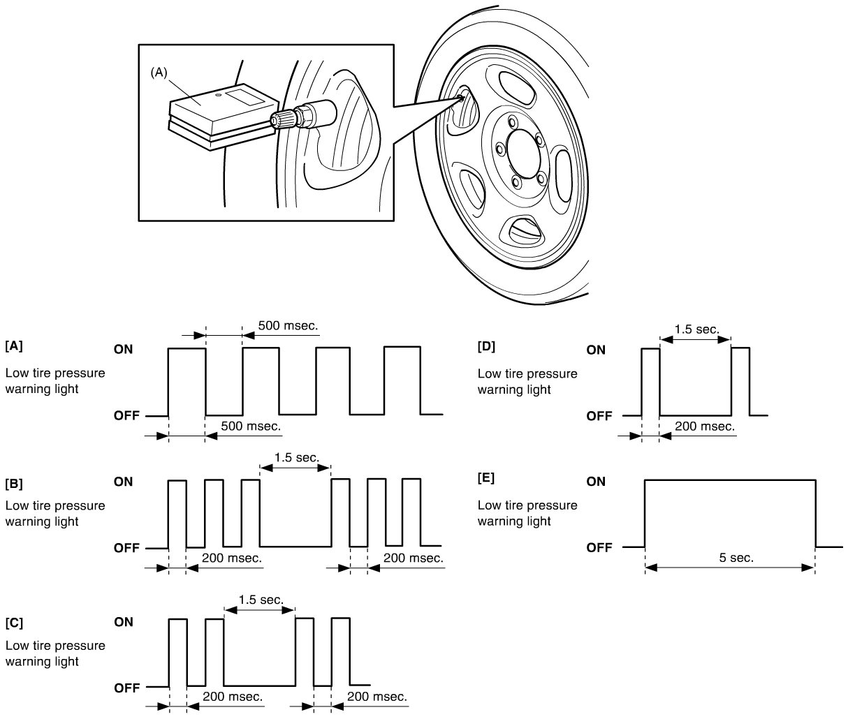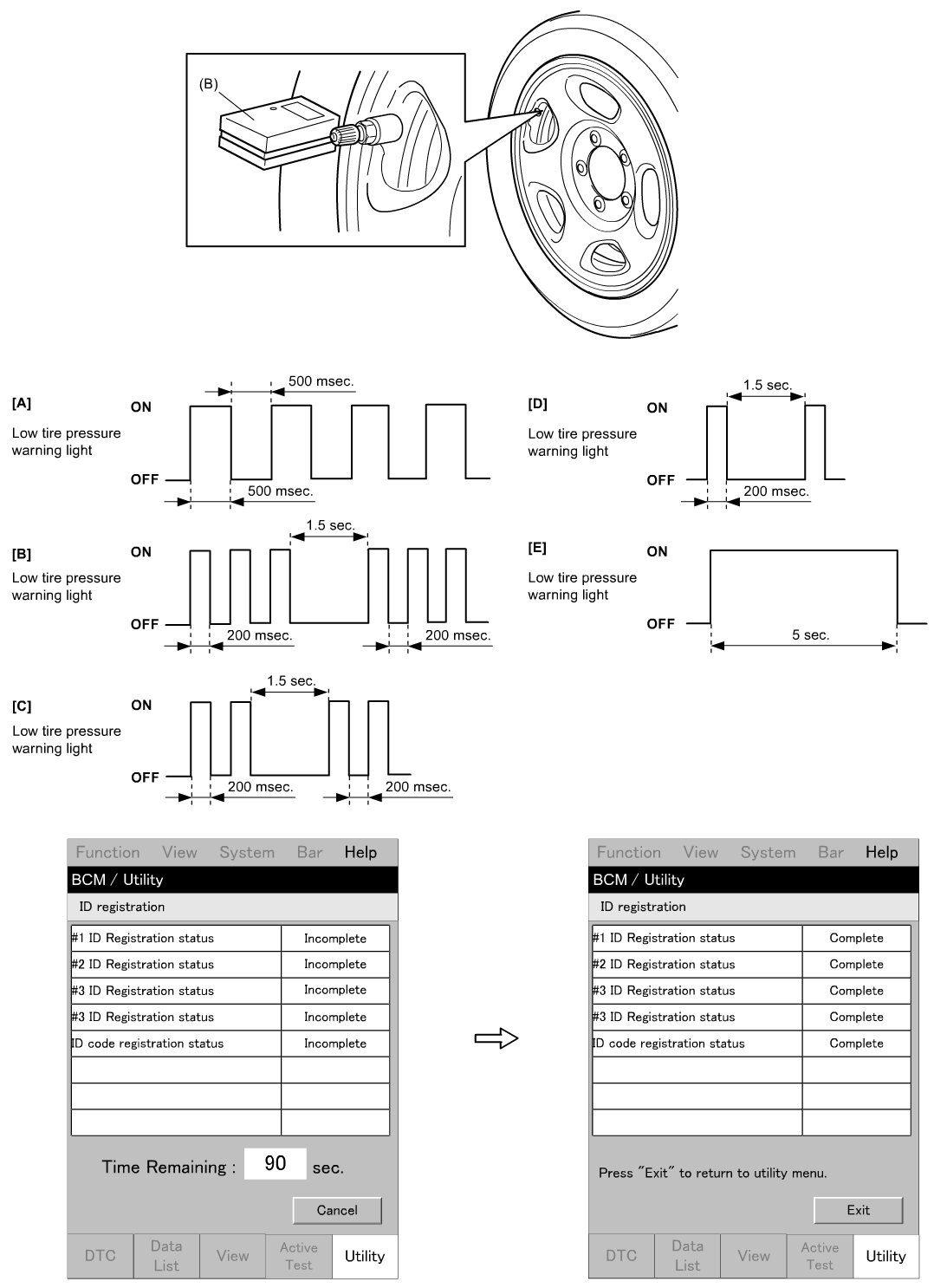 - If each ID code of 4 tire pressure sensors is not registered in BCM within 90 seconds, start all over from Step 1). Also, it is possible to check the number of ID codes of tire pressure sensors received by BCM by observing the flashing pattern of the low tire pressure warning light.