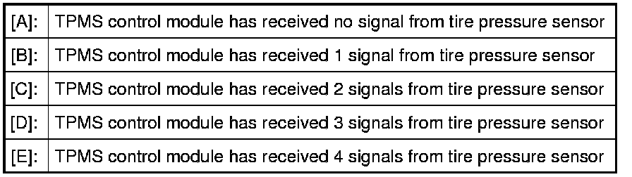 - When BCM receives each ID code of 4 tire pressure sensors, BCM turns ON low tire pressure warning light in combination meter for 5 seconds.
