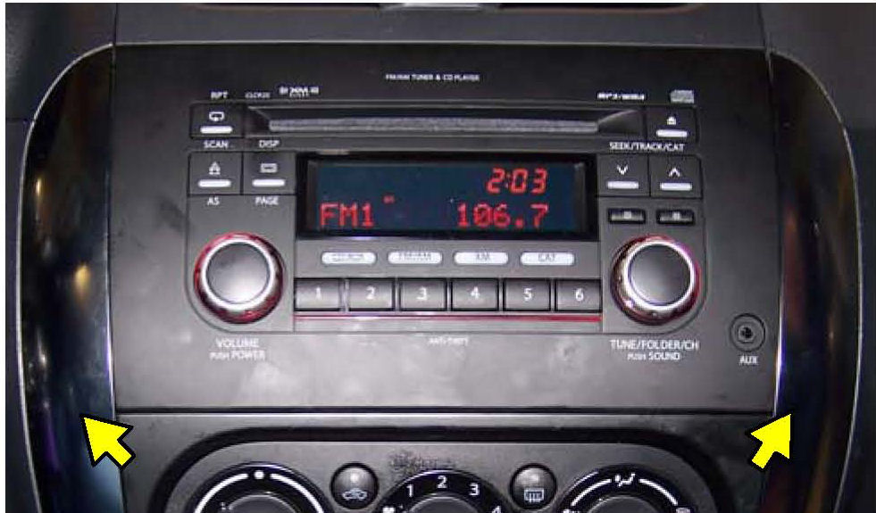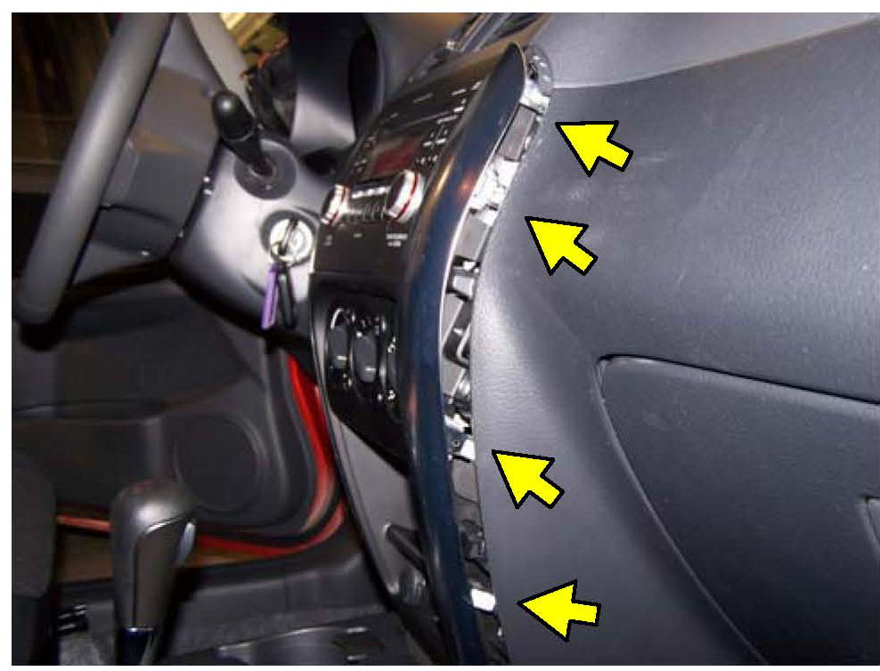4. Using a suitable trim removal tool, taking care not to damage the surrounding dash pieces, lift both trim covers from sides of the center dash array. Start at the lower portion and gently work the anchoring clips outward from the dash.