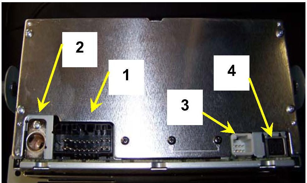 6. Disconnect the radio connector (1), the antenna lead (2), the NAVI harness connector (3) and the iPOD interface (4) (if equipped), and set it aside.