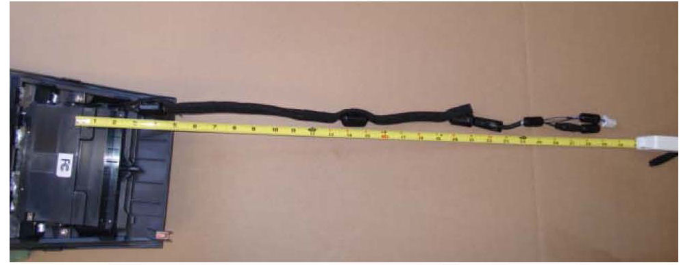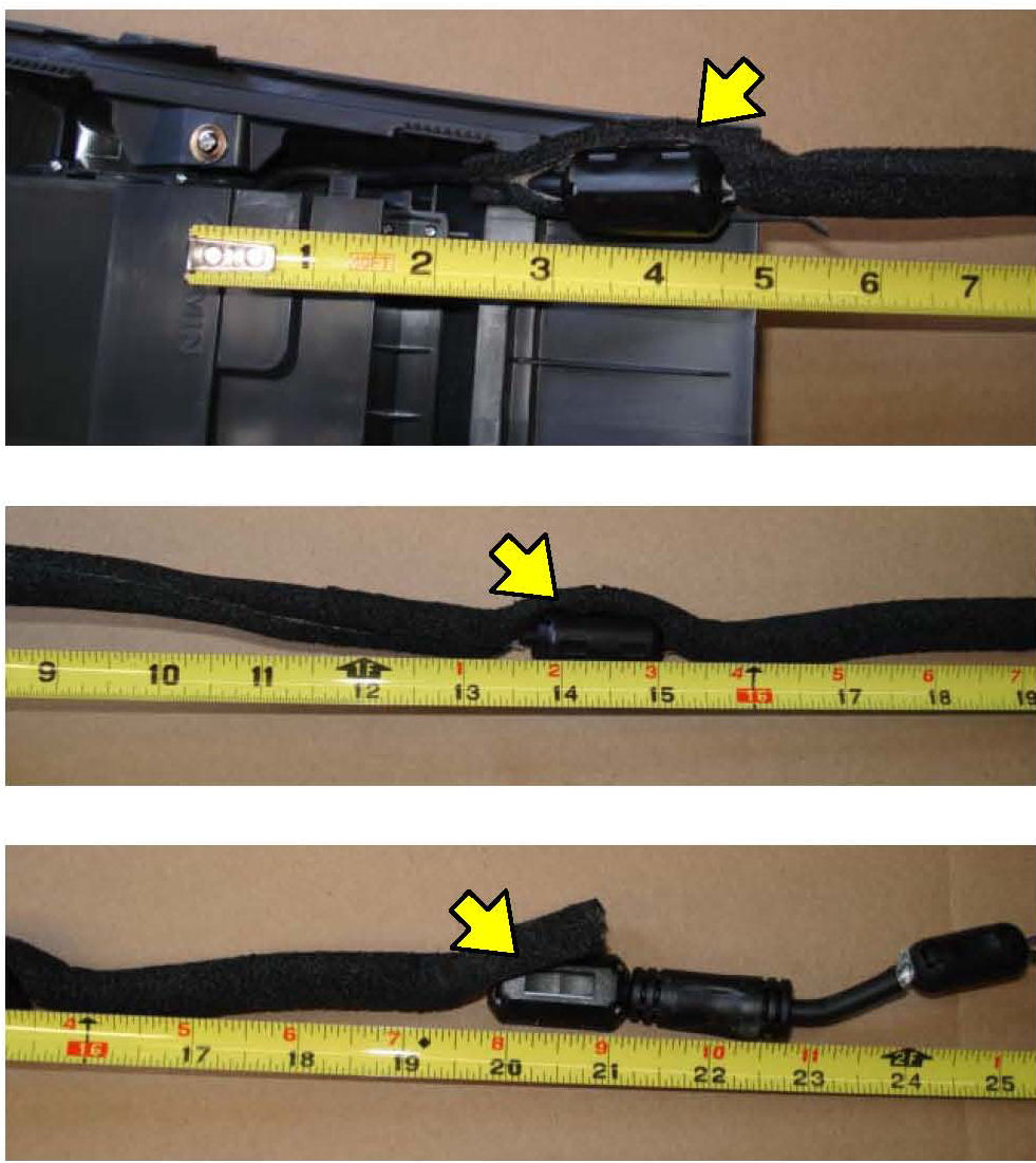 12. Using a measuring tape locate and open the seam of the harness cover approximately 2 inches to allow the ferrite choke to fit around the harness at positions 3 ", 13 " and 20 " distant from where the harness exits the bottom of the cradle.