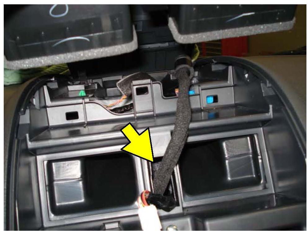 16. Route the harness so that it passes through the opening between the dash vents as shown, making sure that the harness stays clear of the ducts and vent openings in the cradle.