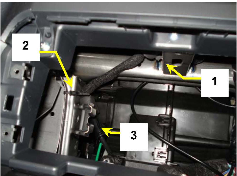 17. Set the cradle assembly back into the dash and route the harness so it reaches into the radio unit space, routing the harness to the left side of the center bracket (1). Using a zip tie (or equivalent), secure the harness to the left hand bracket (2), keeping the harness behind the left rear radio mount (3).