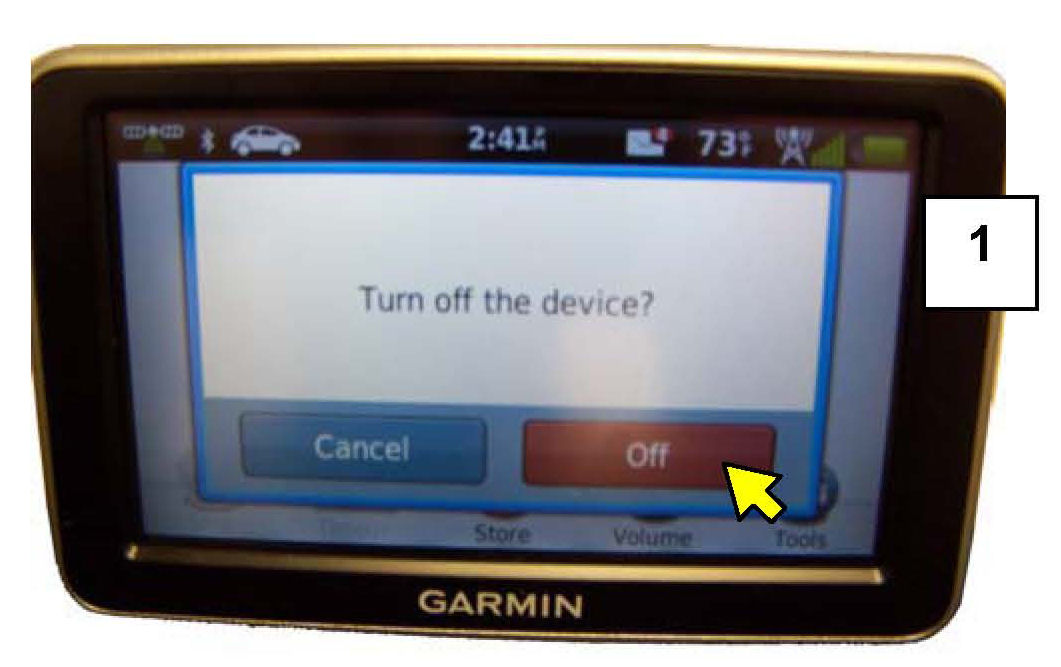 d) Leaving the NAVI in the cradle mount, manually power off the Garmin unit by pressing and holding the power button located on the top left until the display shows the power off dialog window (1). Select the "OFF" option button.