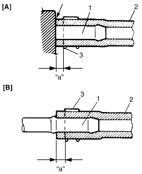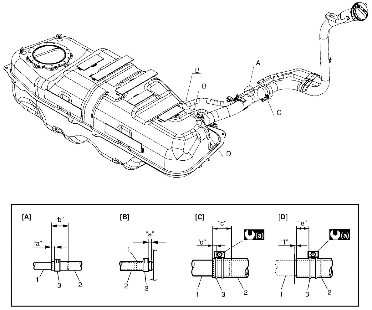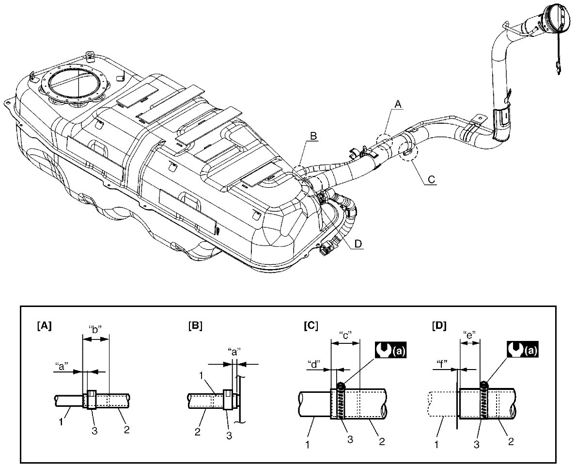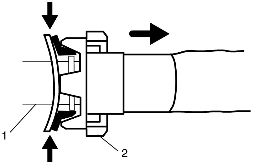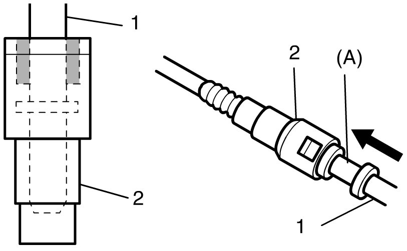 1) Remove mud, dust and/or foreign material between pipe (1) and quick joint (fuel vapor line) (2) by blowing compressed air.