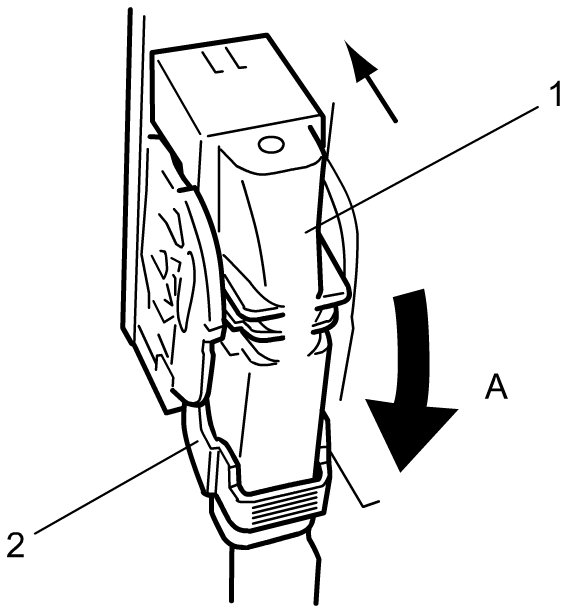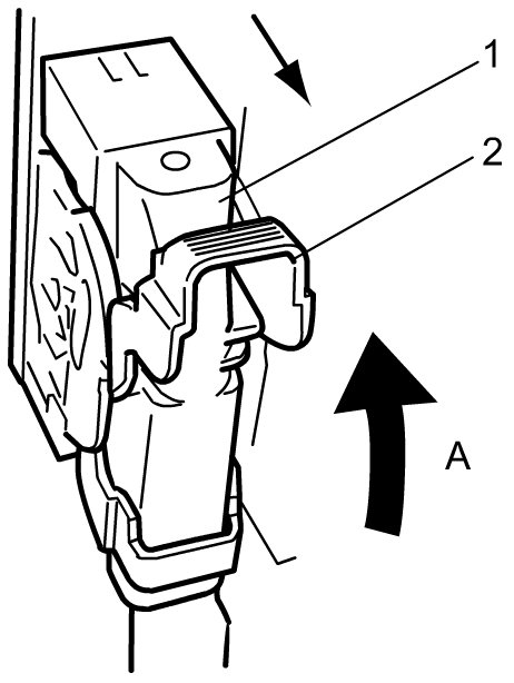 2) Disconnect ESP(R) hydraulic unit / control module assembly connector (1) by pull up the lock lever (2).