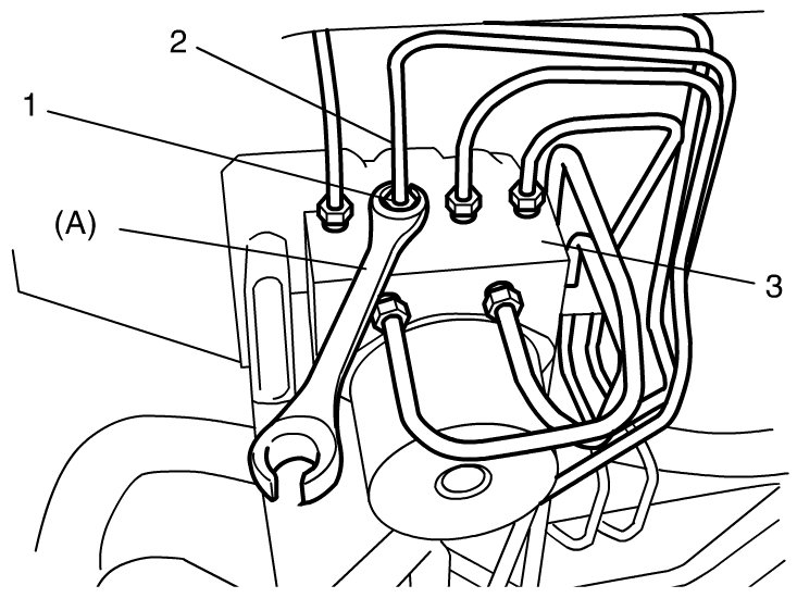 3) Using special tool, loosen flare nuts (1) and disconnect brake pipes (2) from ESP(R) hydraulic unit / control module assembly (3).