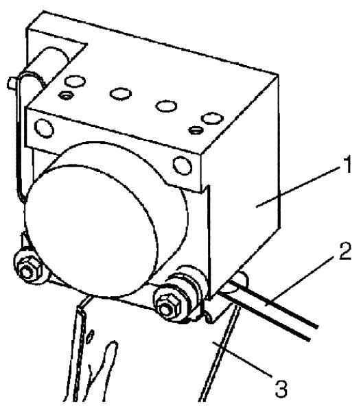 5) Remove bolt and pull out ESP(R) hydraulic unit / control module assembly (1) from bracket (3) using flat end rod or the like (2).