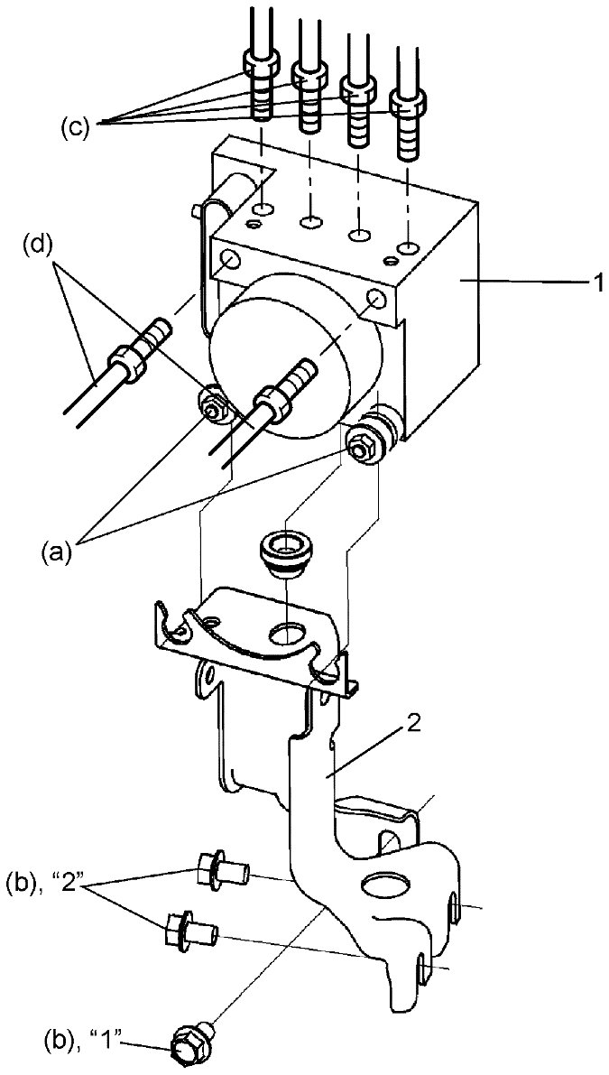 1) Install ESP(R) hydraulic unit / control module assembly (1) to bracket (2).