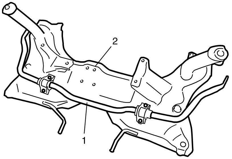 4) Remove stabilizer bar (1) with stabilizer bush from front suspension frame (2).