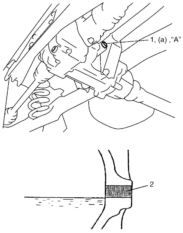 2) Remove oil level / filler plug (1) and check oil contamination and oil level is lower end of oil level / filler plug hole (2).