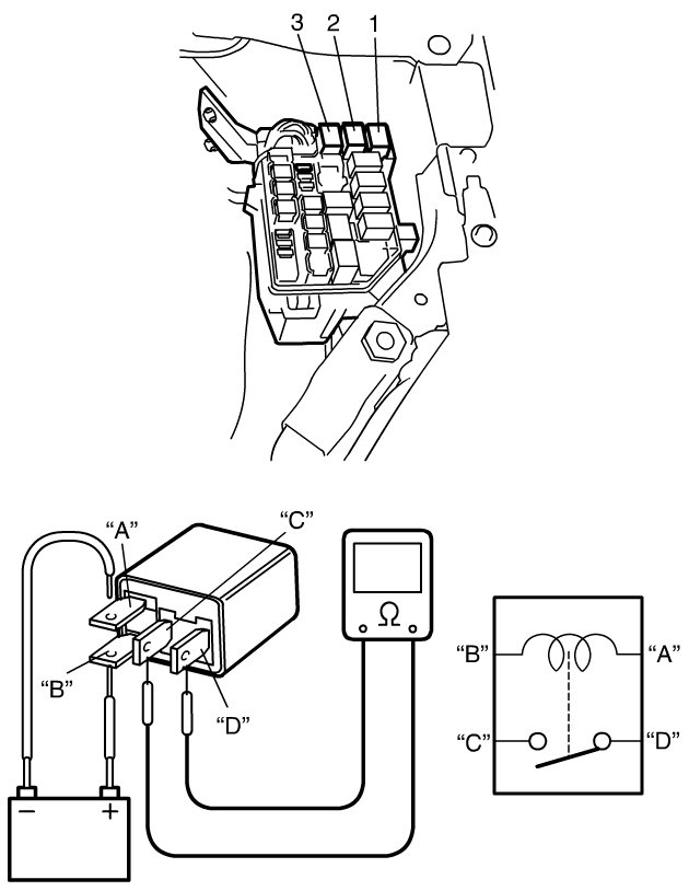 a) Check that there is no continuity between terminals "C" and "D". If there is continuity, replace relay.