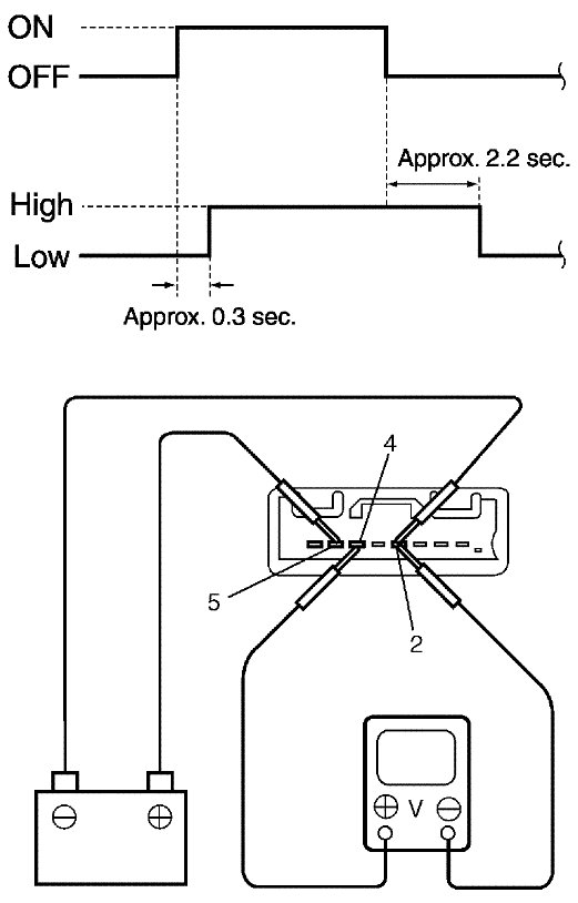 7) Connect disconnected jumper wire end to terminal "2", then check that voltage between terminal "4" and terminal "2" changes as shown.