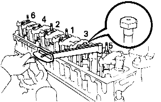 Install and uniformly tighten the eight bolts and four nuts in several passes, in the sequence shown.