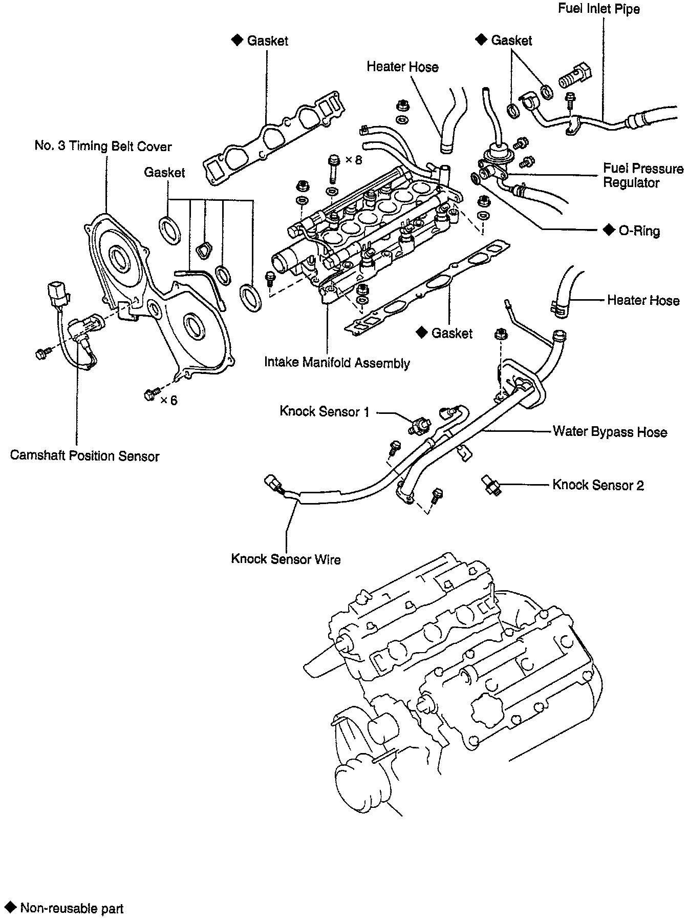 2. REINSTALL WATER BYPASS PIPE AND KNOCK SENSOR WIRE.