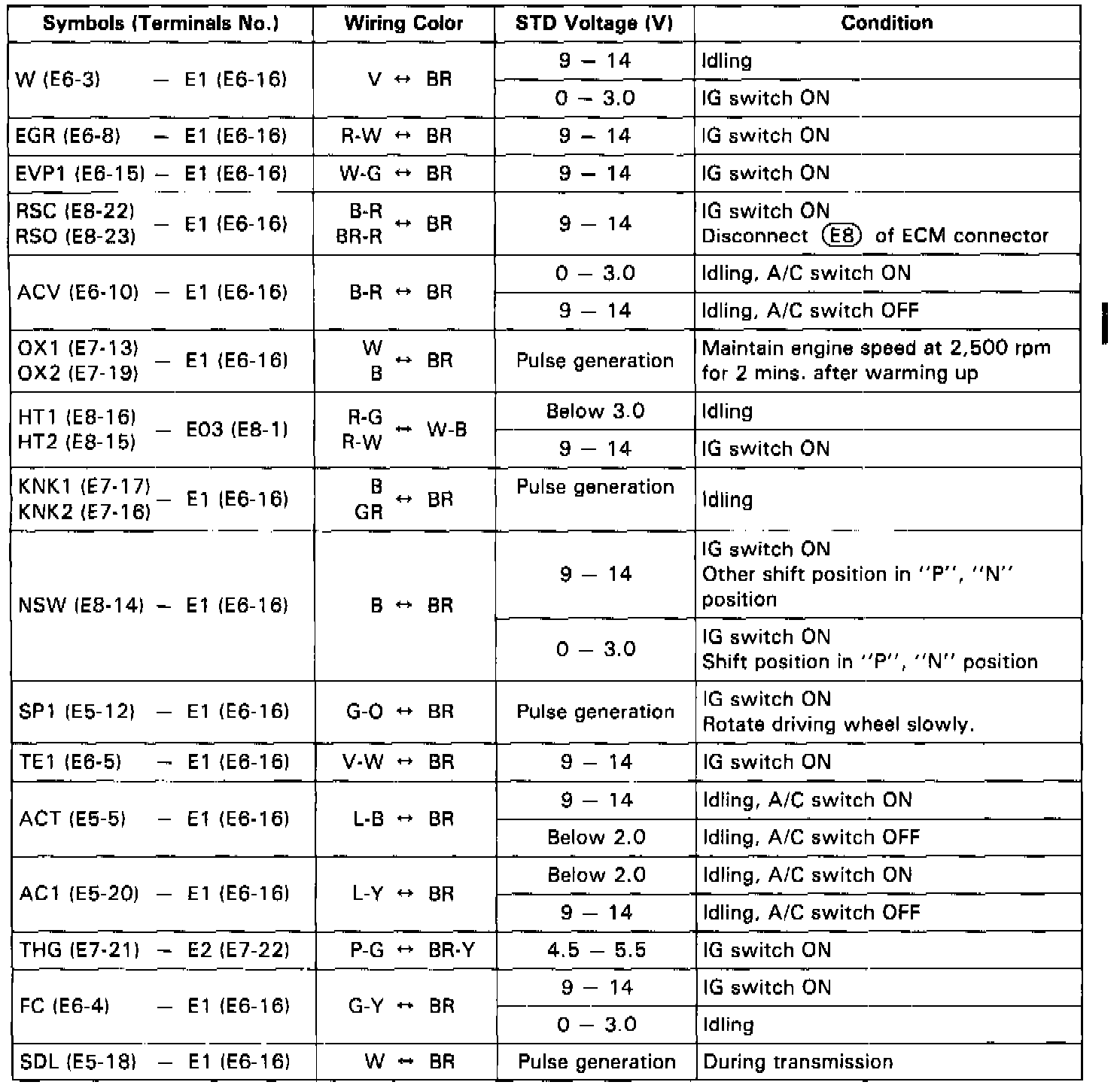 When measuring the voltage or resistance of the connector part of the ECM, always insert the test probe into the connector from the wire harness side.