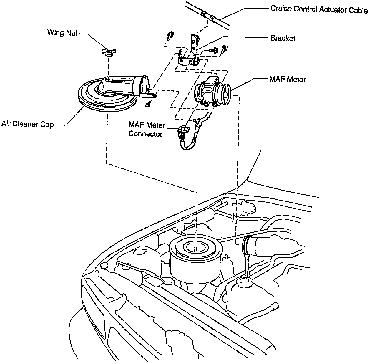- Disconnect the 3 clips, and remove the wing nut, air cleaner cap and MAF meter.