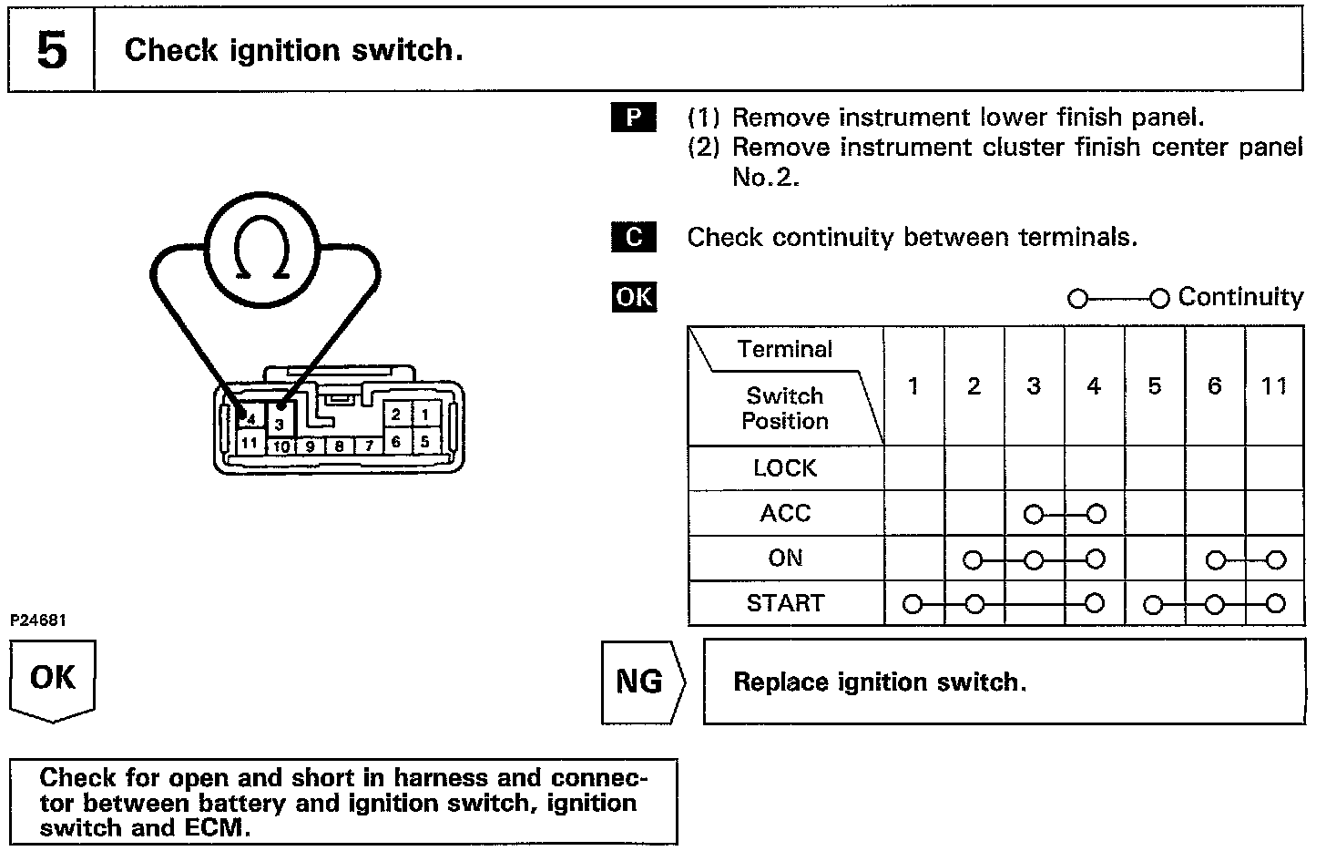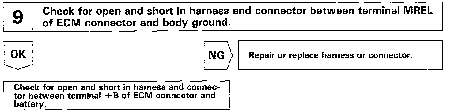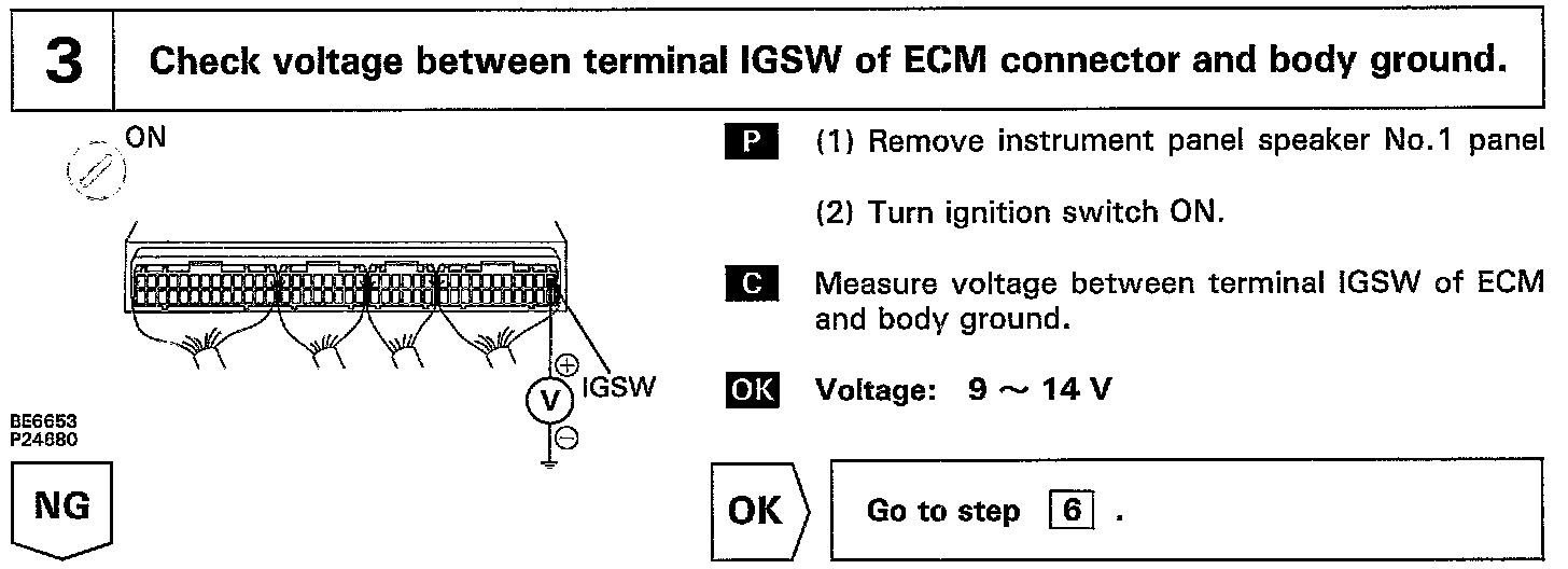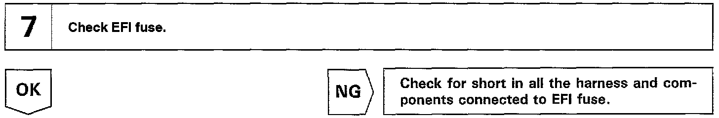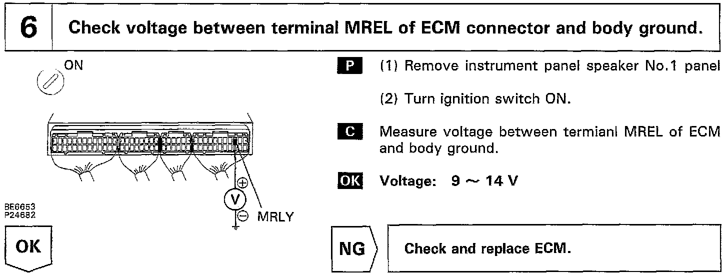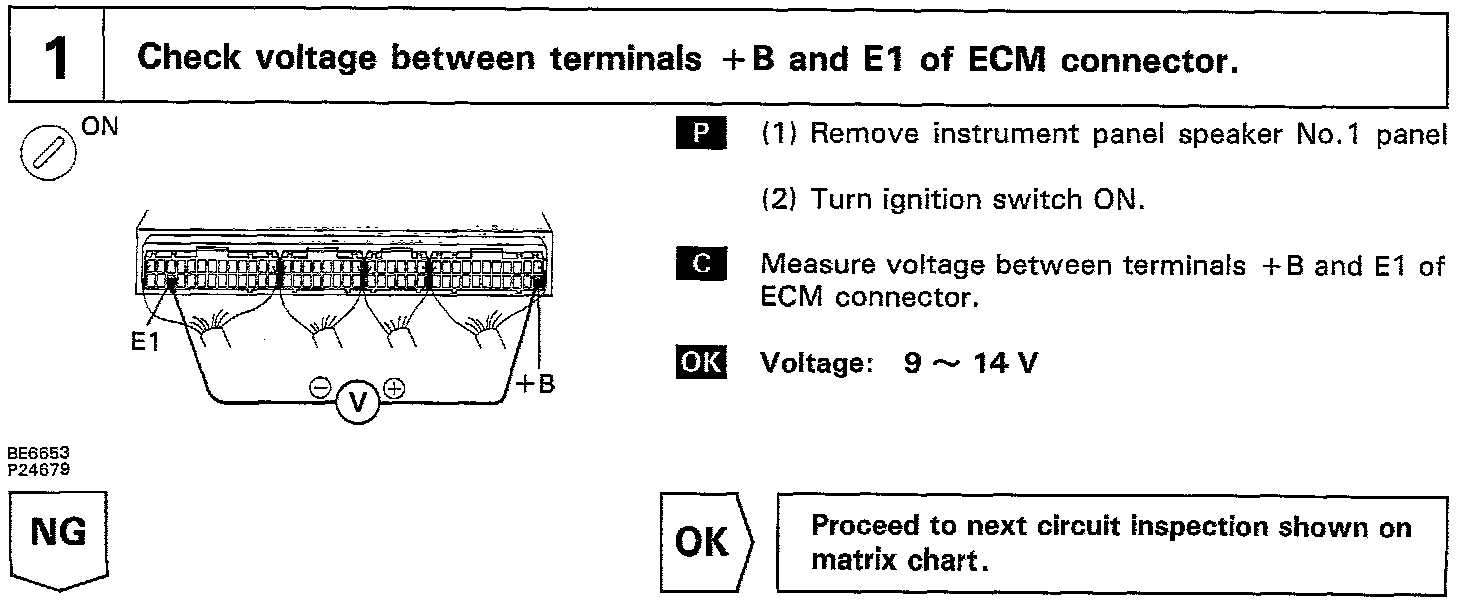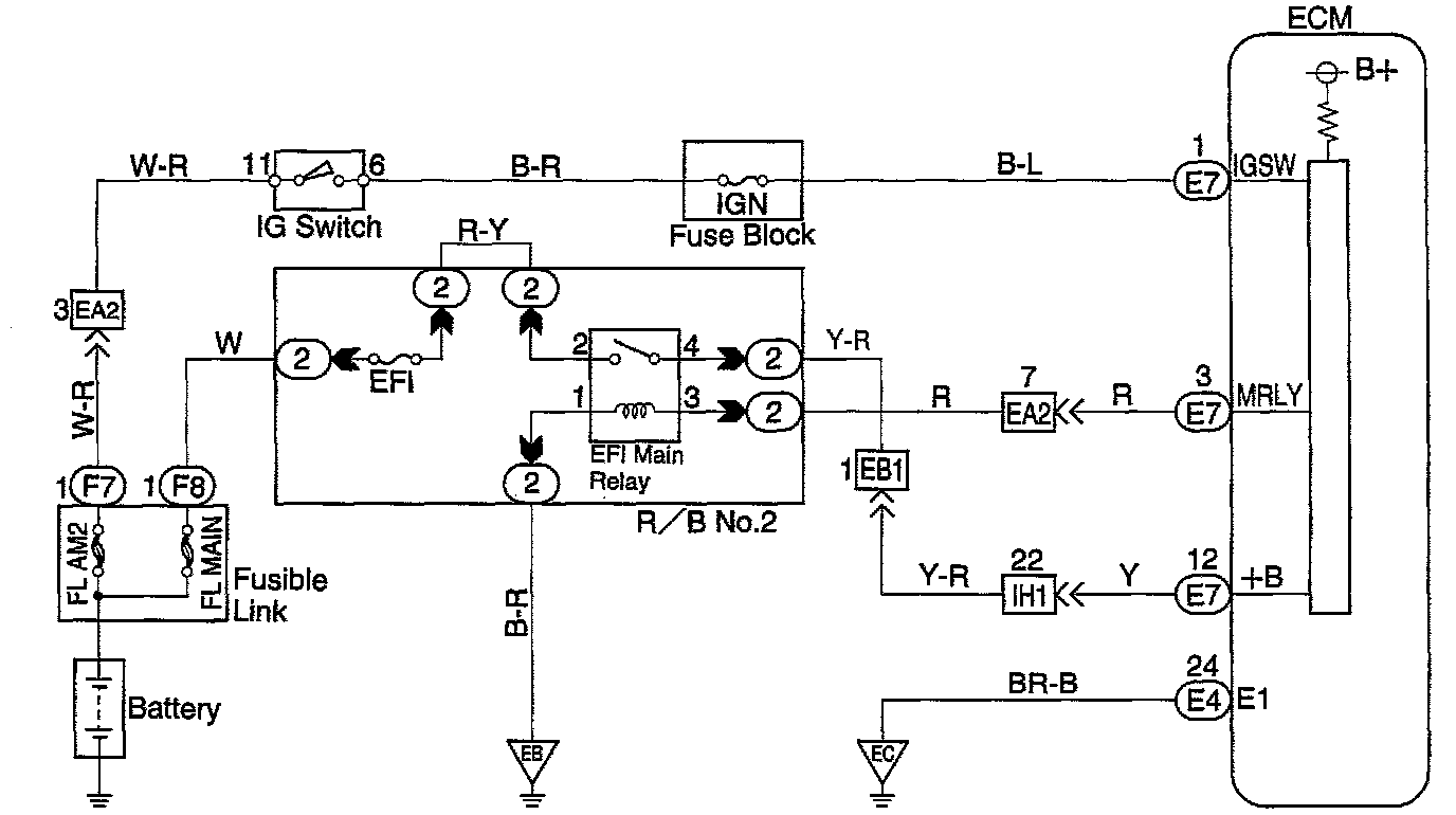 When the ignition switch is turned ON, battery positive voltage is applied to the coil, closing the contacts of the EFI main relay and supplying power to the terminals +B of the ECM.