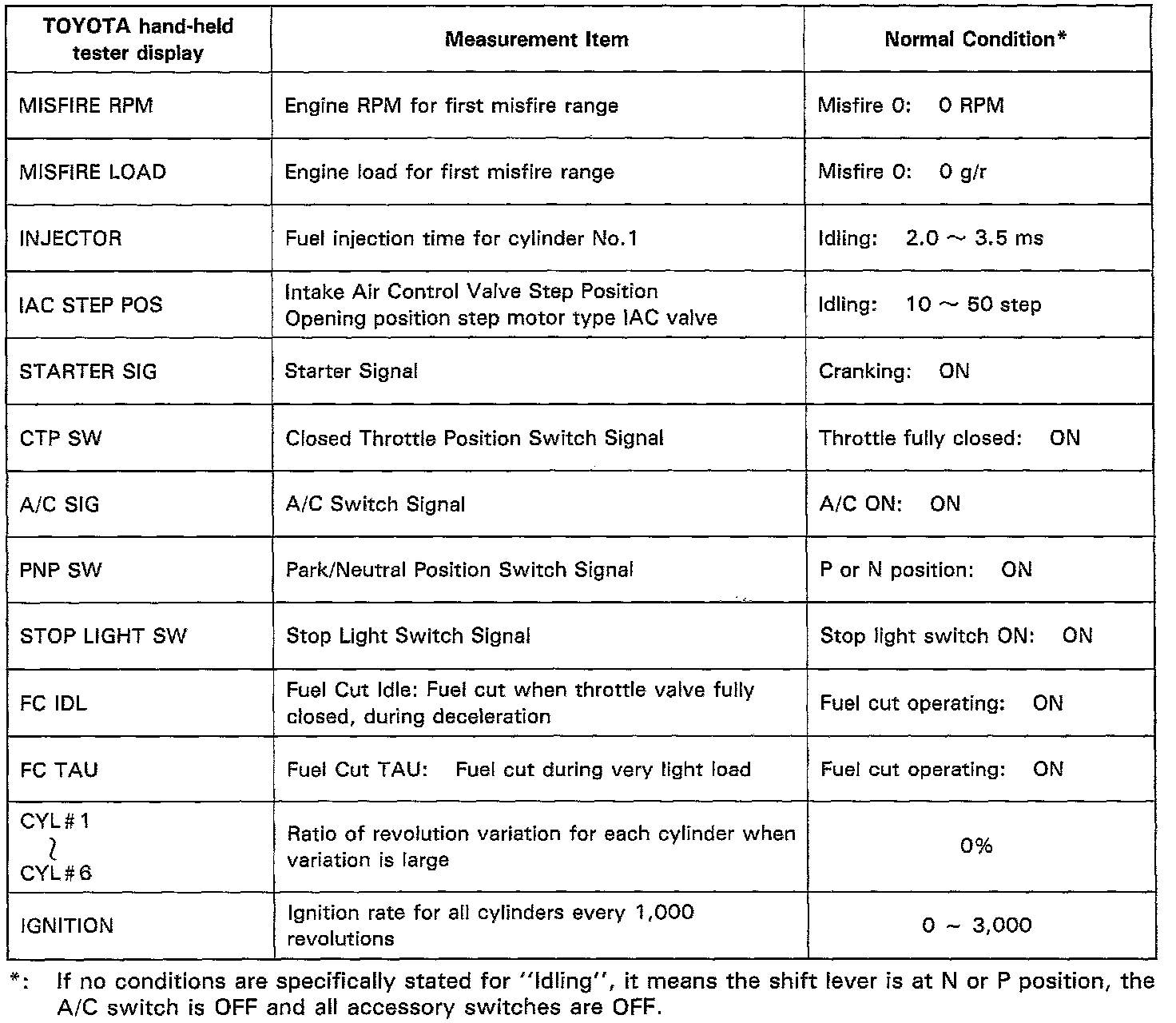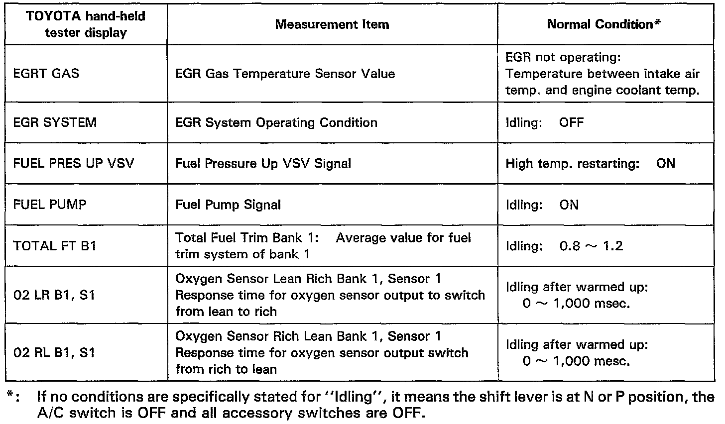 NOTICE: The values given below for "Normal Condition" are representative values, so a vehicle may still be normal even if its value varies from those listed here. So do not decide whether a part is faulty or not solely according to the "Normal Condition" here.