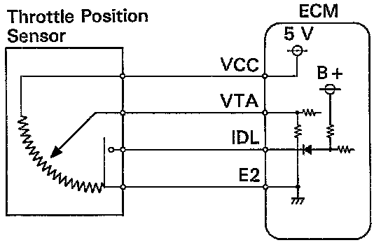 The throttle position sensor is mounted in the throttle body and detects the throttle valve opening angle. When the throttle valve is fully closed, the IDL contacts in the throttle position sensor are on, so the voltage at the terminal IDL of the ECM becomes 0 V. At this time, a voltage of approximately 0.3 ~ 0.8 V is applied to terminal VTA of the ECM. When the throttle valve is opened, the IDL contacts go off and thus the power source voltage of approximately 12 V in the ECM is applied to the terminal IDL of the ECM. The voltage applied to the terminal VTA of the ECM increases in proportion to the opening angle of the throttle valve and becomes approximately 3.2 ~ 4.9 V when the throttle valve is fully opened. The ECM judges the vehicle driving conditions from these signals input from terminals VTA and IDL, and uses them as one of the conditions for deciding the air-fuel ratio correction, power increase correction and fuel-cut control etc.