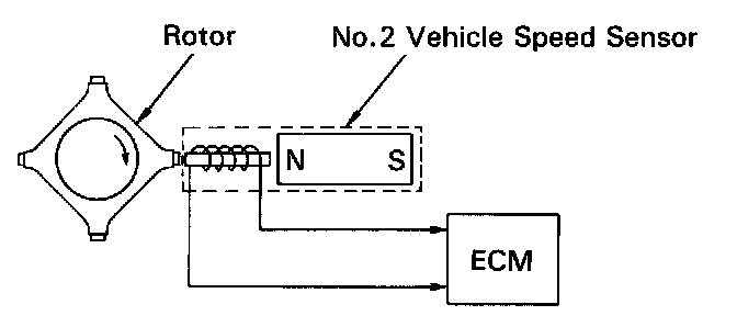 The No.2 vehicle speed sensor detects the rotation speed of the transmission output shaft and sends signals to the ECM. The ECM determines the vehicle speed based on the these signals. An AC voltage is generated in the No.2 vehicle speed sensor coil as the rotor mounted on the output shaft rotates, and this voltage is sent to the ECM.
