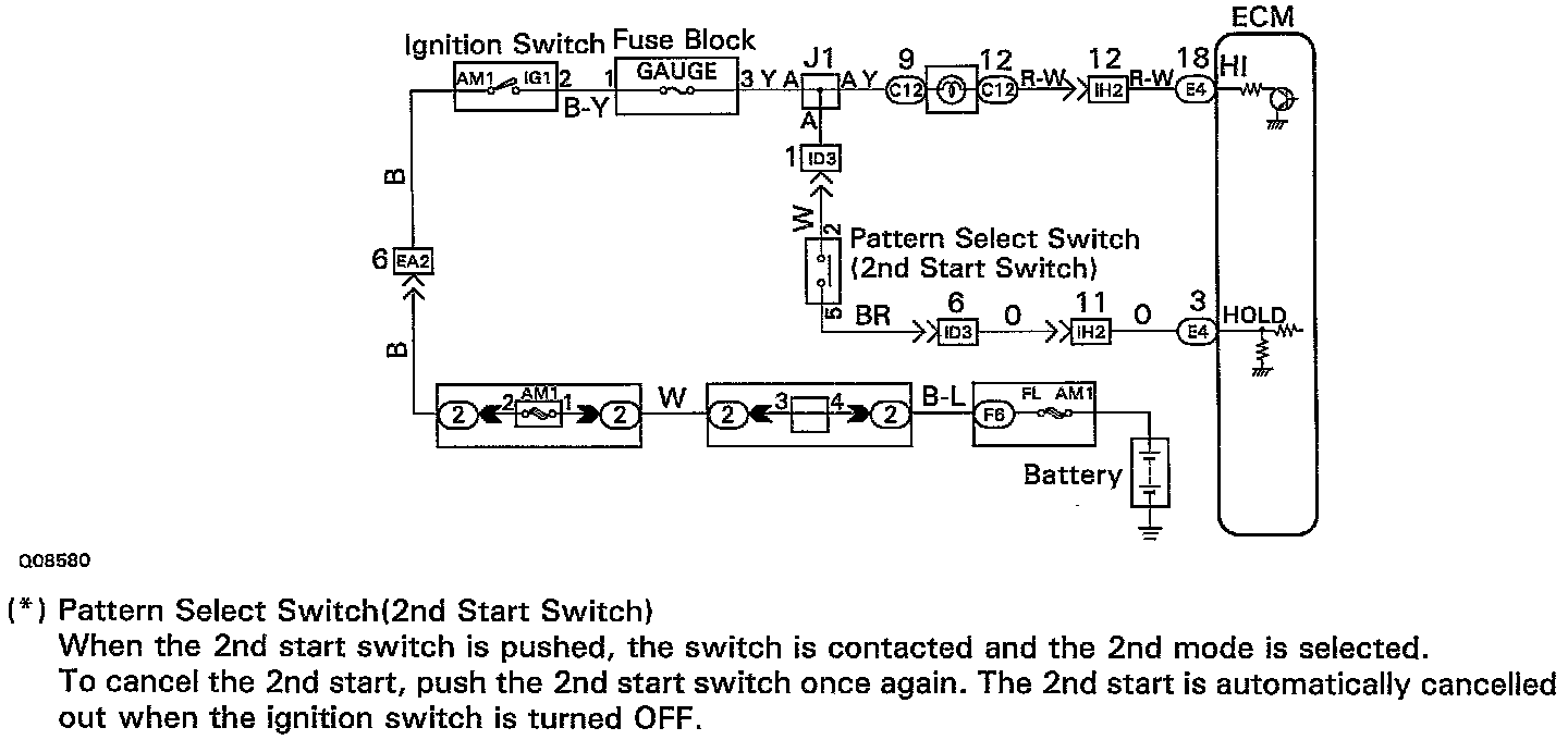When 2nd start mode is selected with the pattern select switch, the ECM controls the solenoid valves and the transmission starts from 2nd gear.