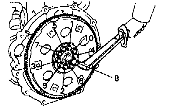 Install and uniformly tighten the 10 drive plate bolts, in several passes. in the sequence shown.