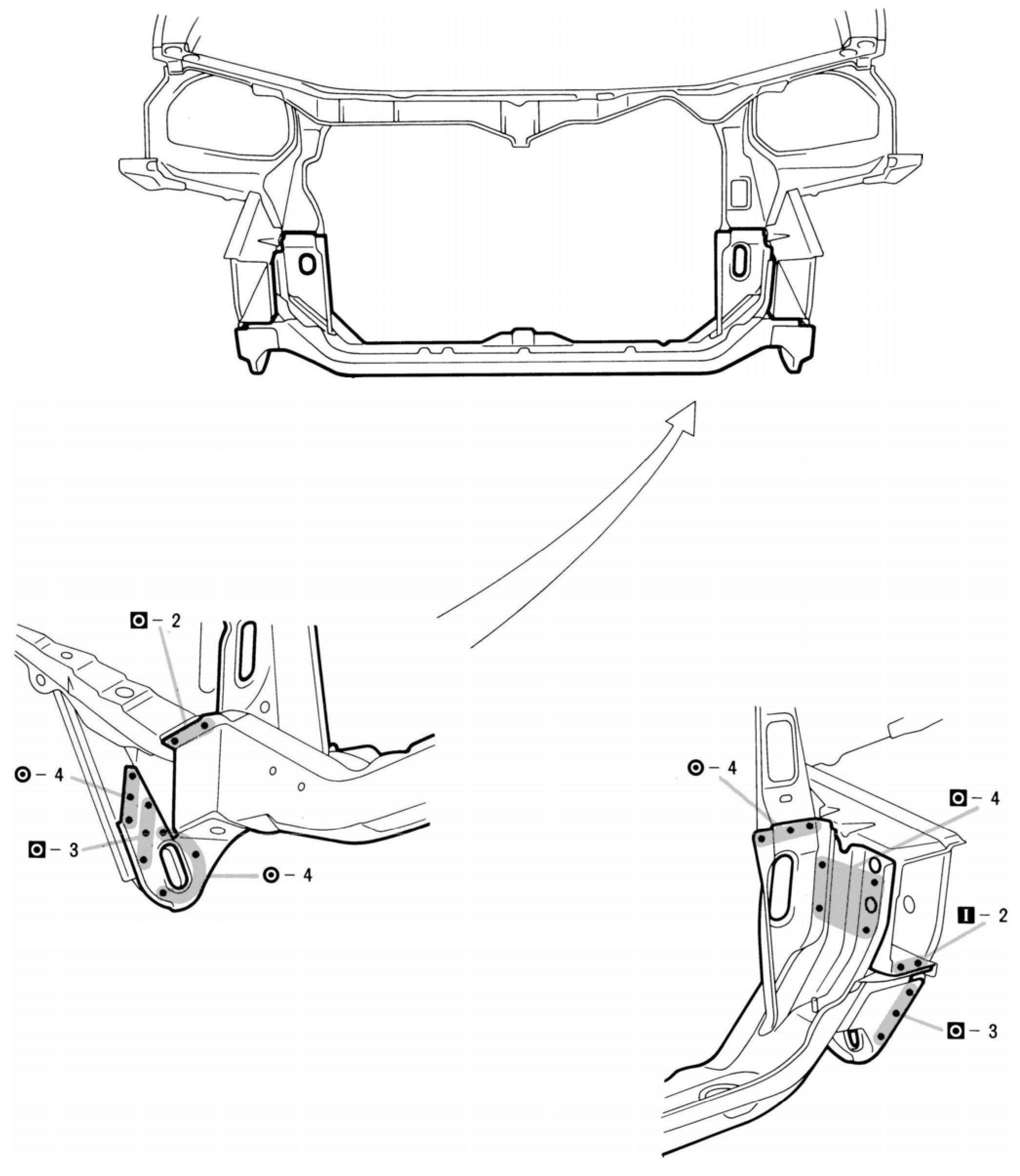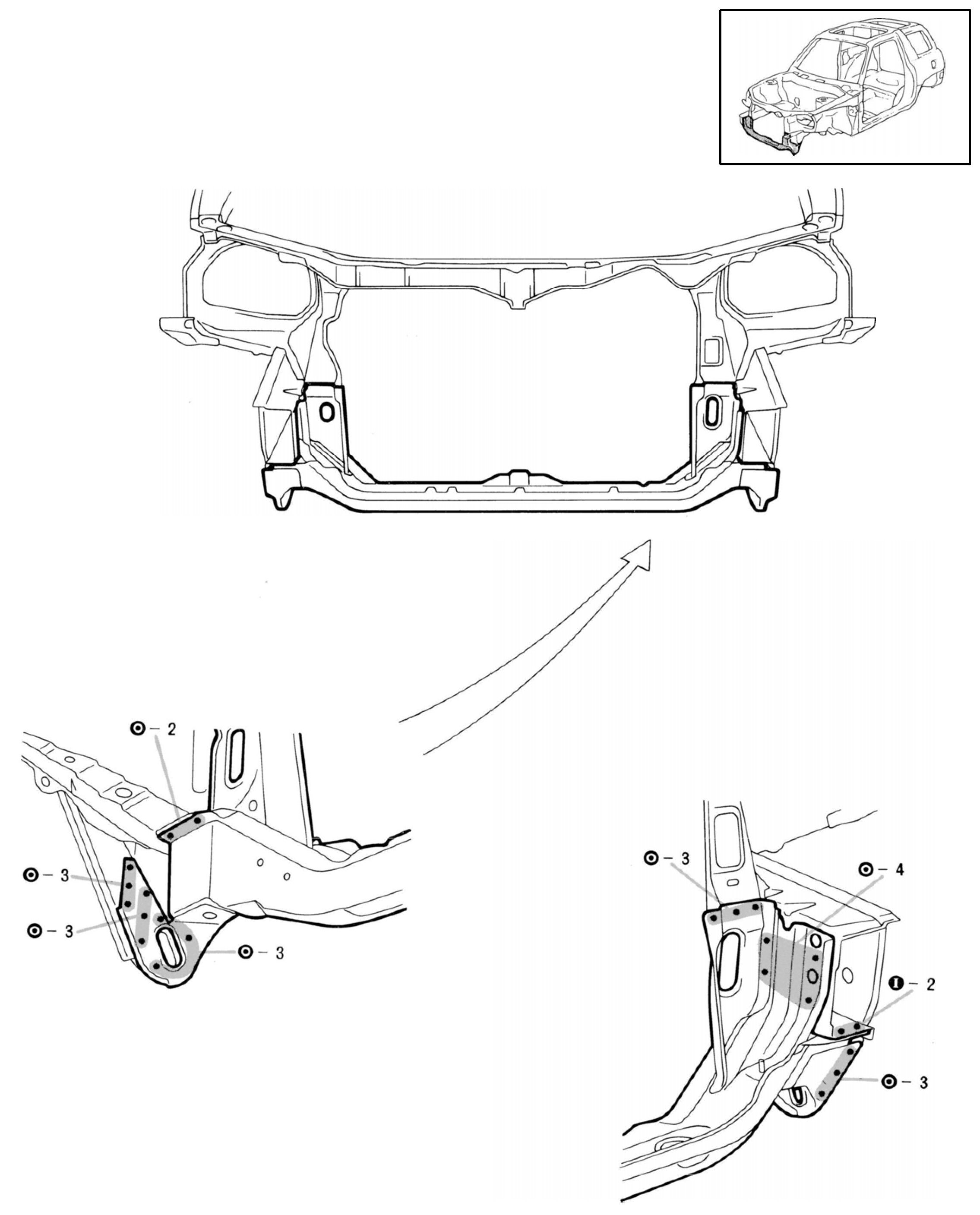 Temporarily install the new parts and measure each part in accordance with the body dimension diagram.