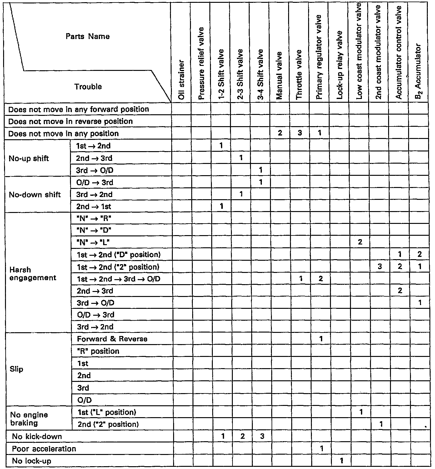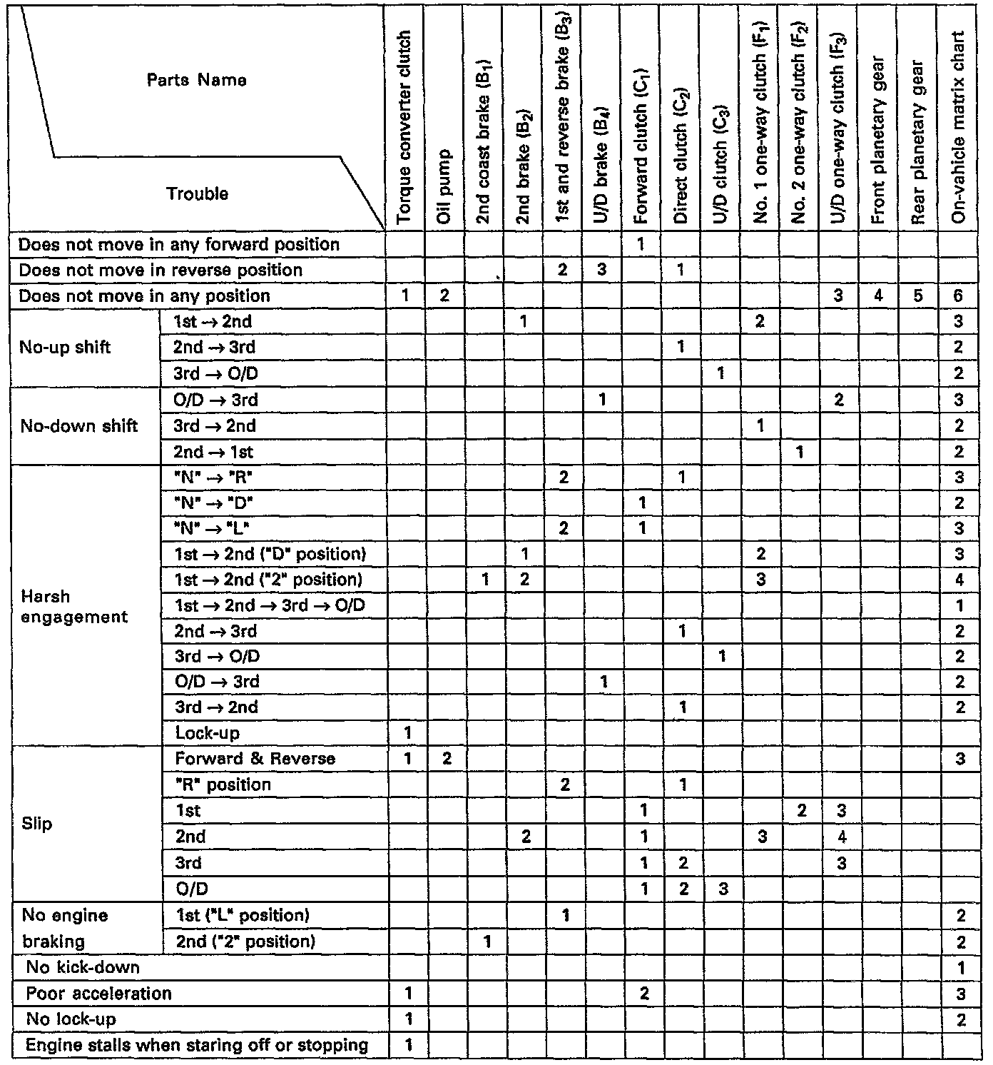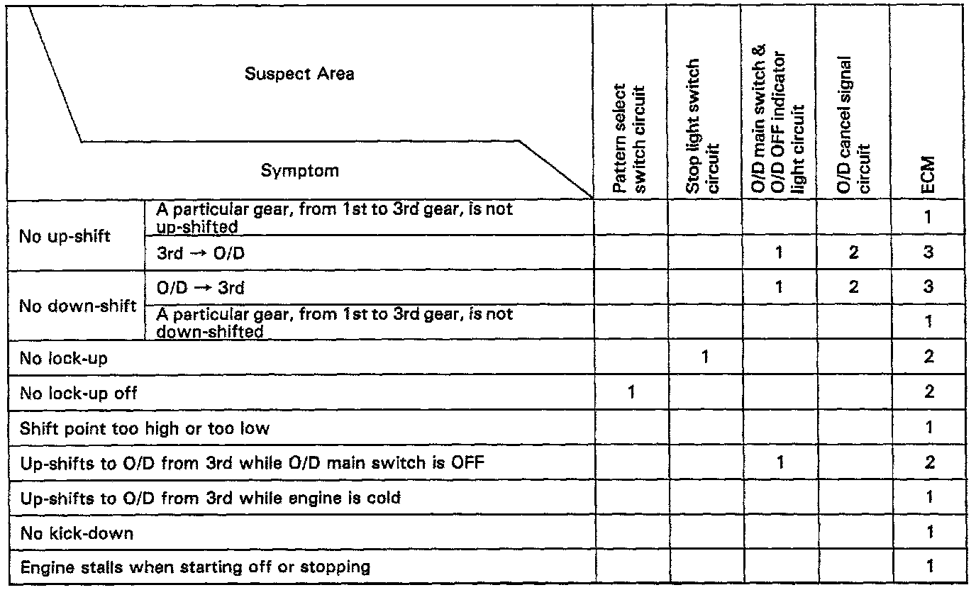 If a normal code is displayed during the DTC check but the trouble still occurs, check the circuits for each symptom in the order given in the charts on the following charts and proceed to the chart given for troubleshooting.The Matrix Chart is divided into 3 sections.