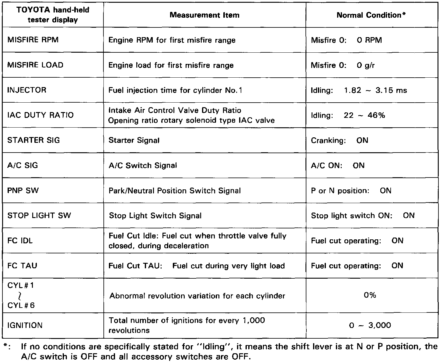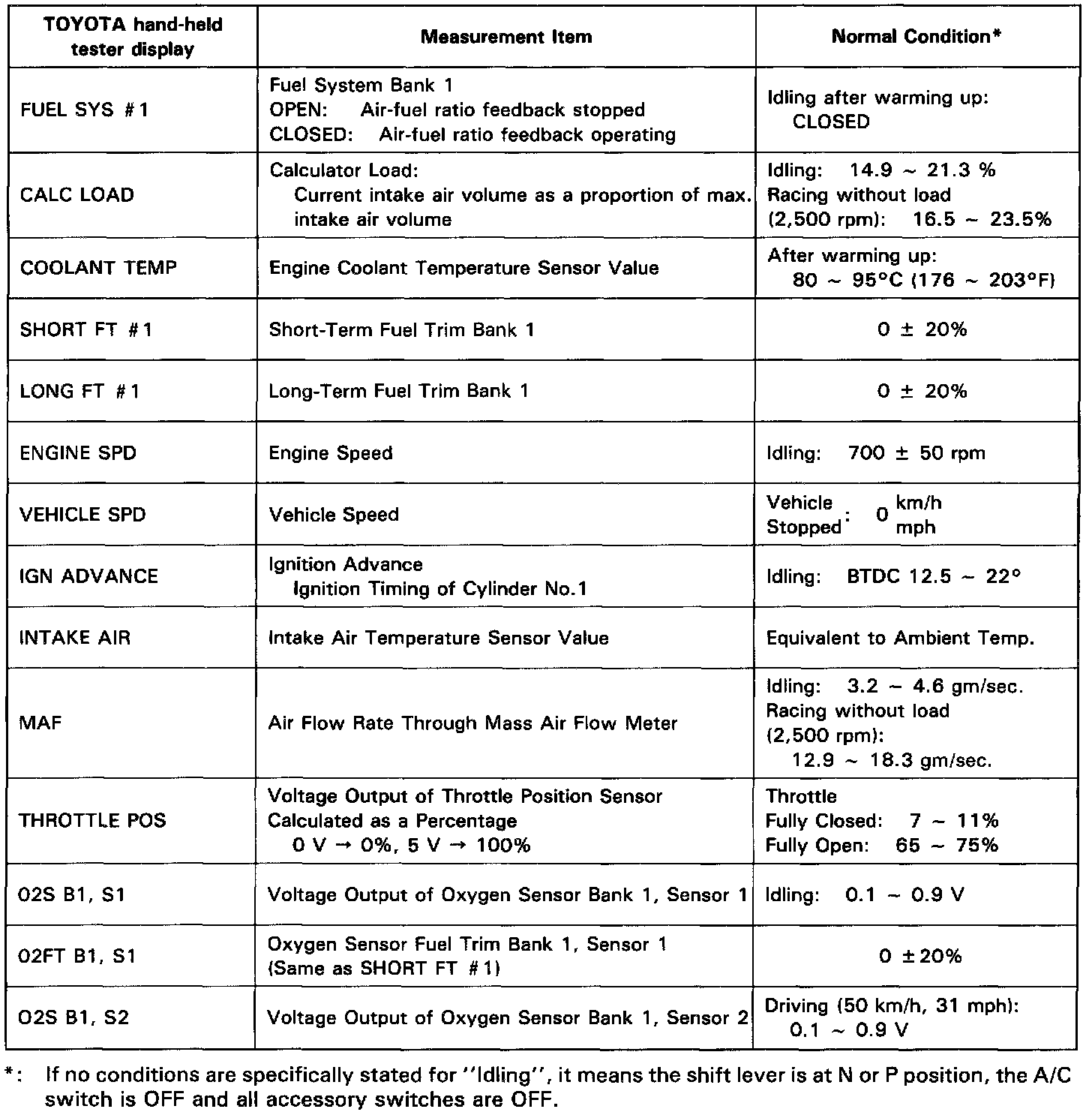 NOTICE: The values given below for "Normal Condition" are representative values. so a vehicle may still be normal even if its value varies from those listed here. So do not decide whether a part is faulty or not solely according to the "Normal Condition" here.