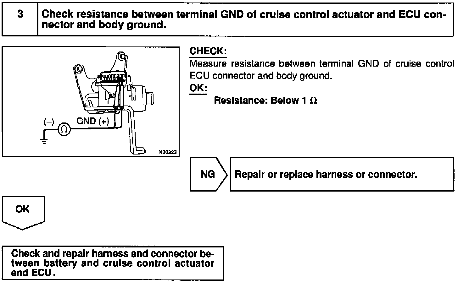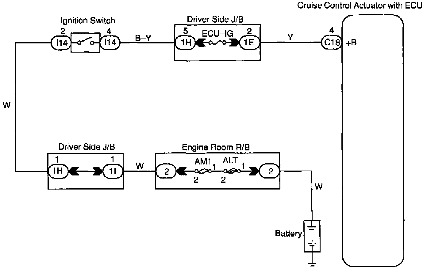 The ECU power source supplies power to the actuator and sensors, etc., when terminal GND and the cruise control ECU case are grounded.