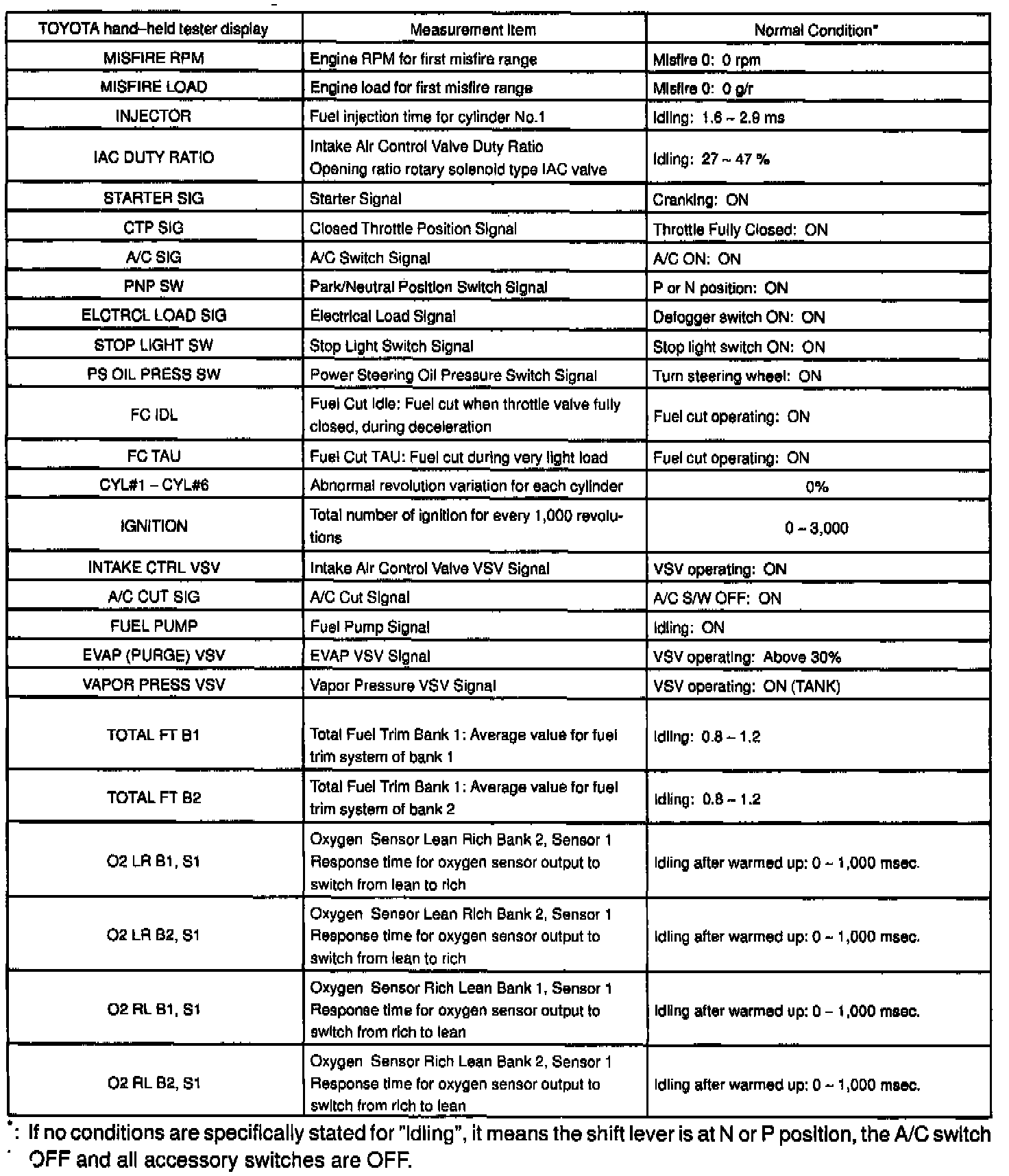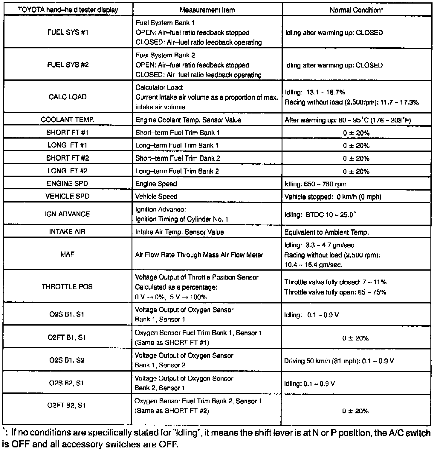 NOTICE: The values given below for "Normal Condition" are representative values, so a vehicle may still be normal even if its value from those listed here. So do not decide whether a part is faulty or not solely according to the "Normal Condition" here.