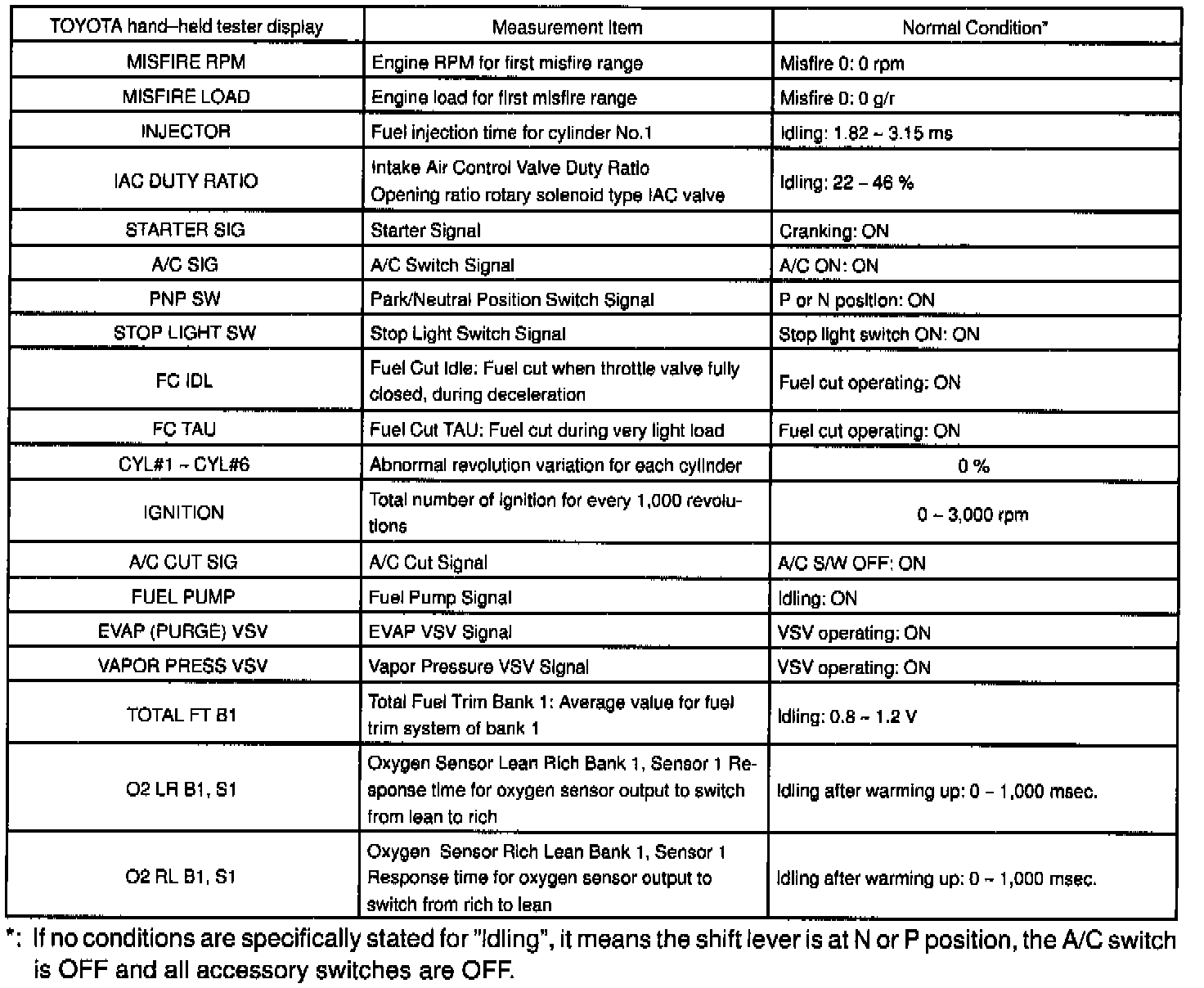NOTICE: The values given below for "Normal Condition" are representative values, so a vehicle may still be normal even if its value from those listed here. So do not decide whether a part is faulty or not solely according to the "Normal Condition" here.