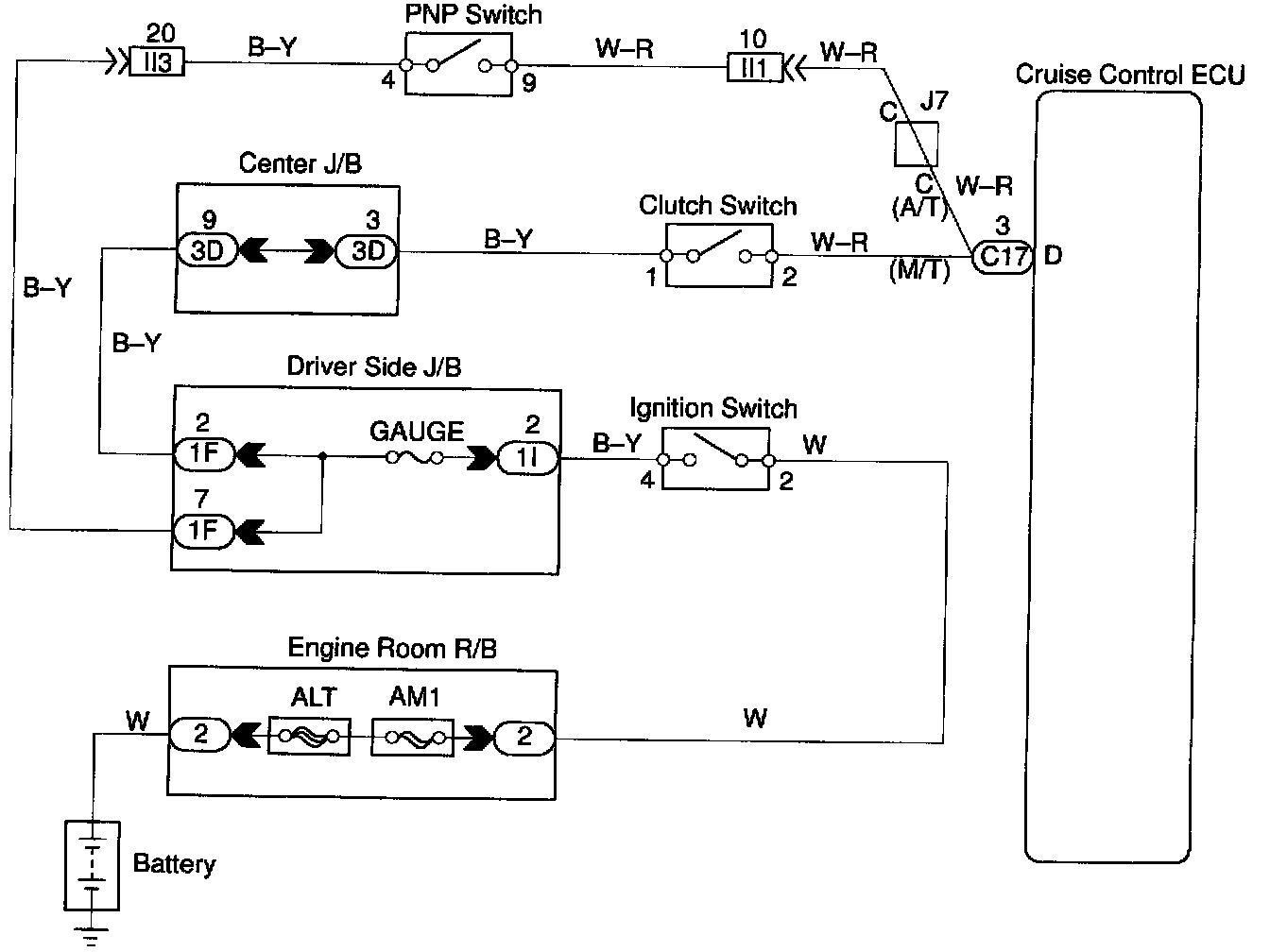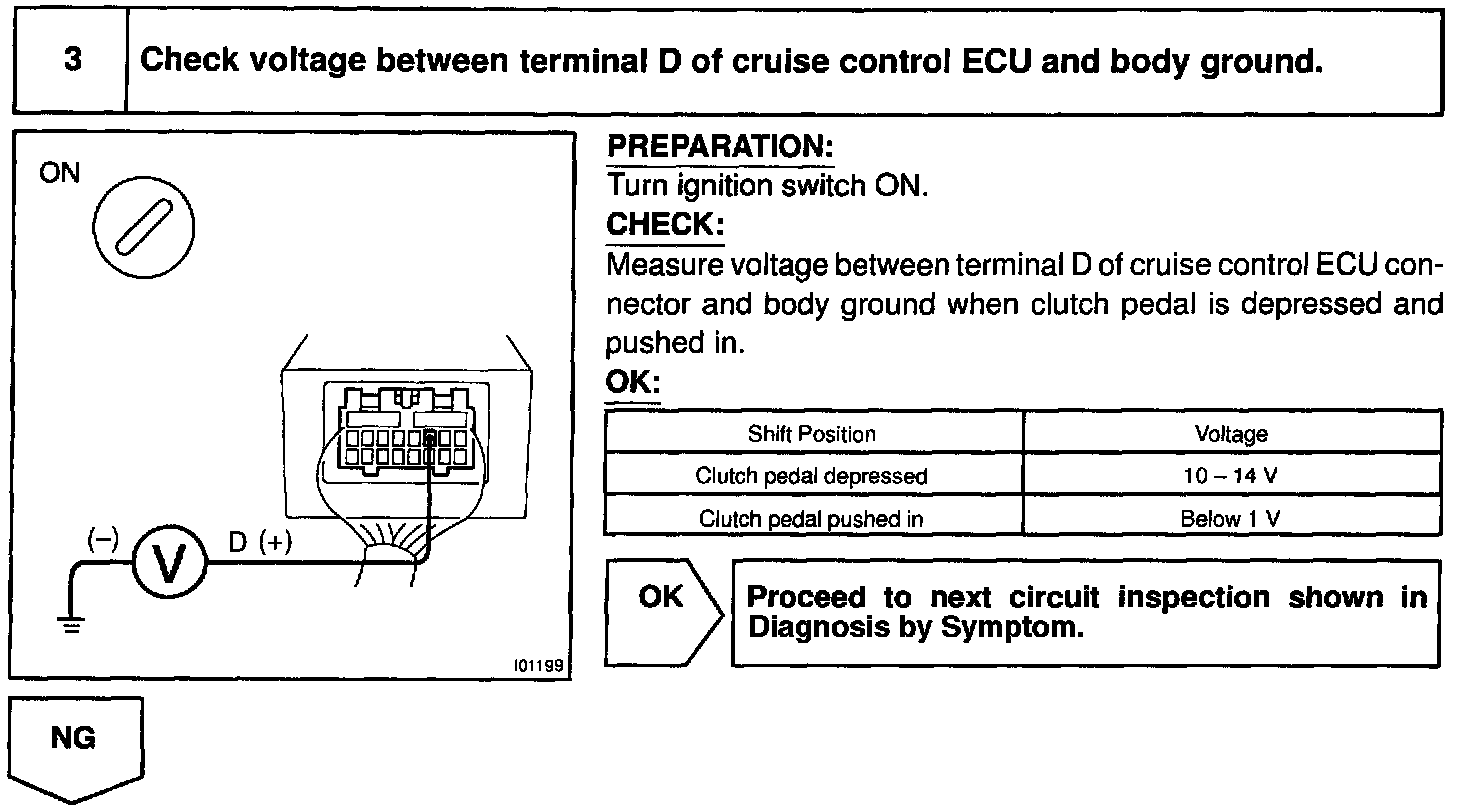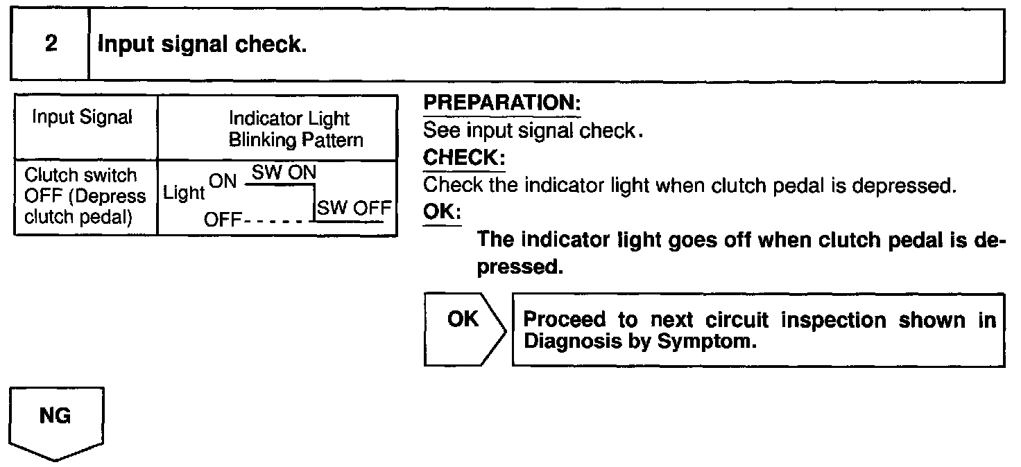 CIRCUIT DESCRIPTIONWhen the clutch pedal is depressed, the clutch switch sends a signal to the cruise control ECU. When the signal is input to the cruise control ECU during cruise control driving, the cruise control ECU cancels cruise control.
