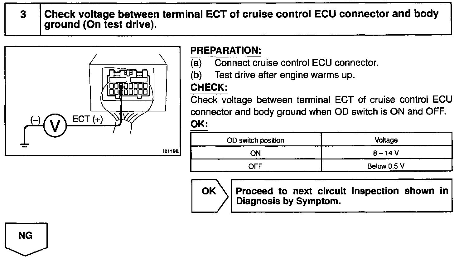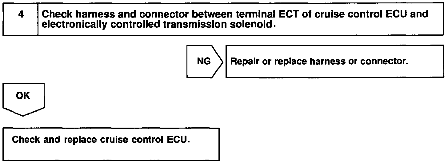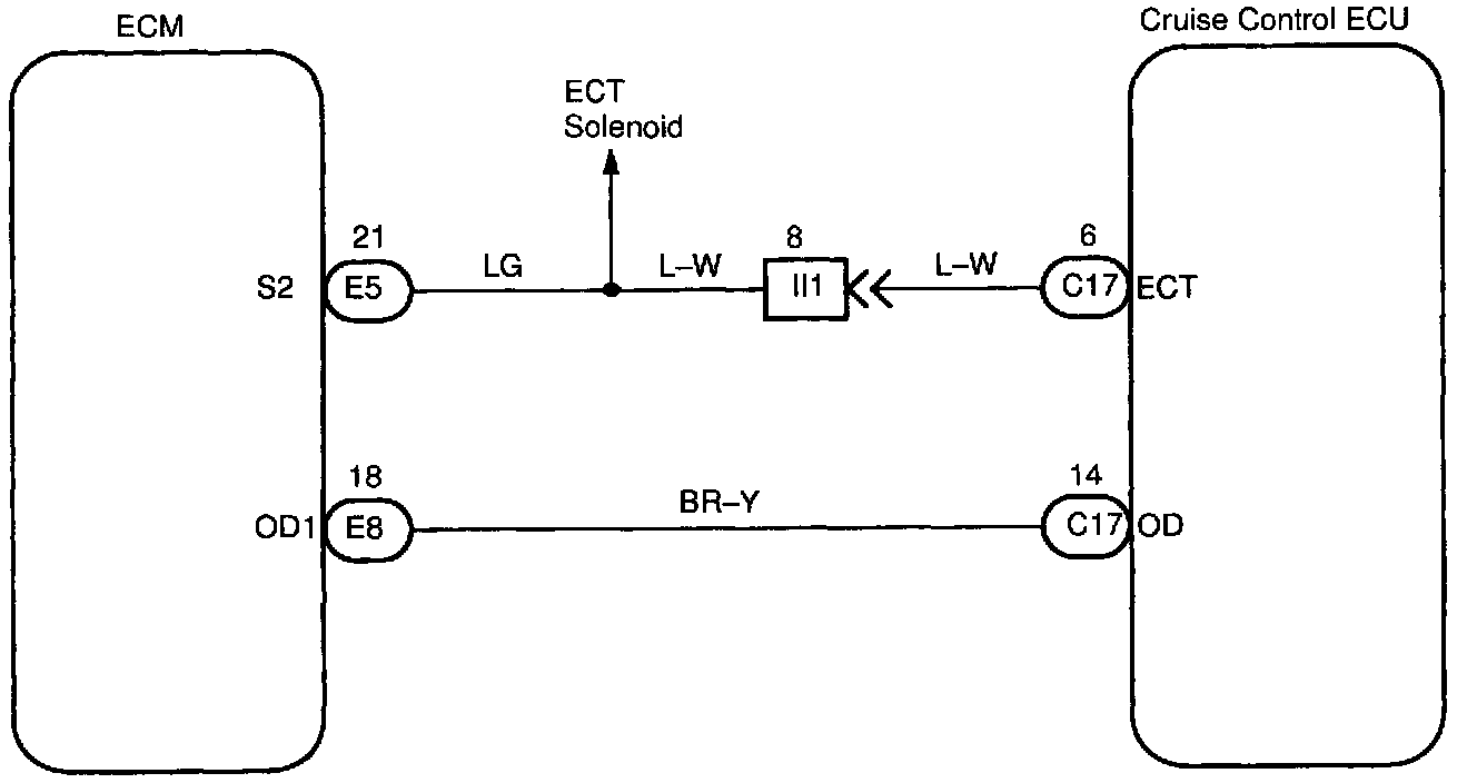 Terminal ECM of the cruise control ECU detects the shift change signal (output to electronically controlled transmission No.2 solenoid) from the electronically controlled transmission.
