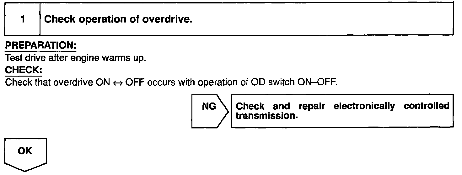 CIRCUIT DESCRIPTIONWhen driving uphill under cruise control, in order to reduce shifting due to ON-OFF overdrive operation and to provide smooth driving, when down shifting in the electronically controlled transmission occurs, a signal to prevent upshift until the end of the uphill slope is sent from the cruise control ECU to the electronically controlled transmission.