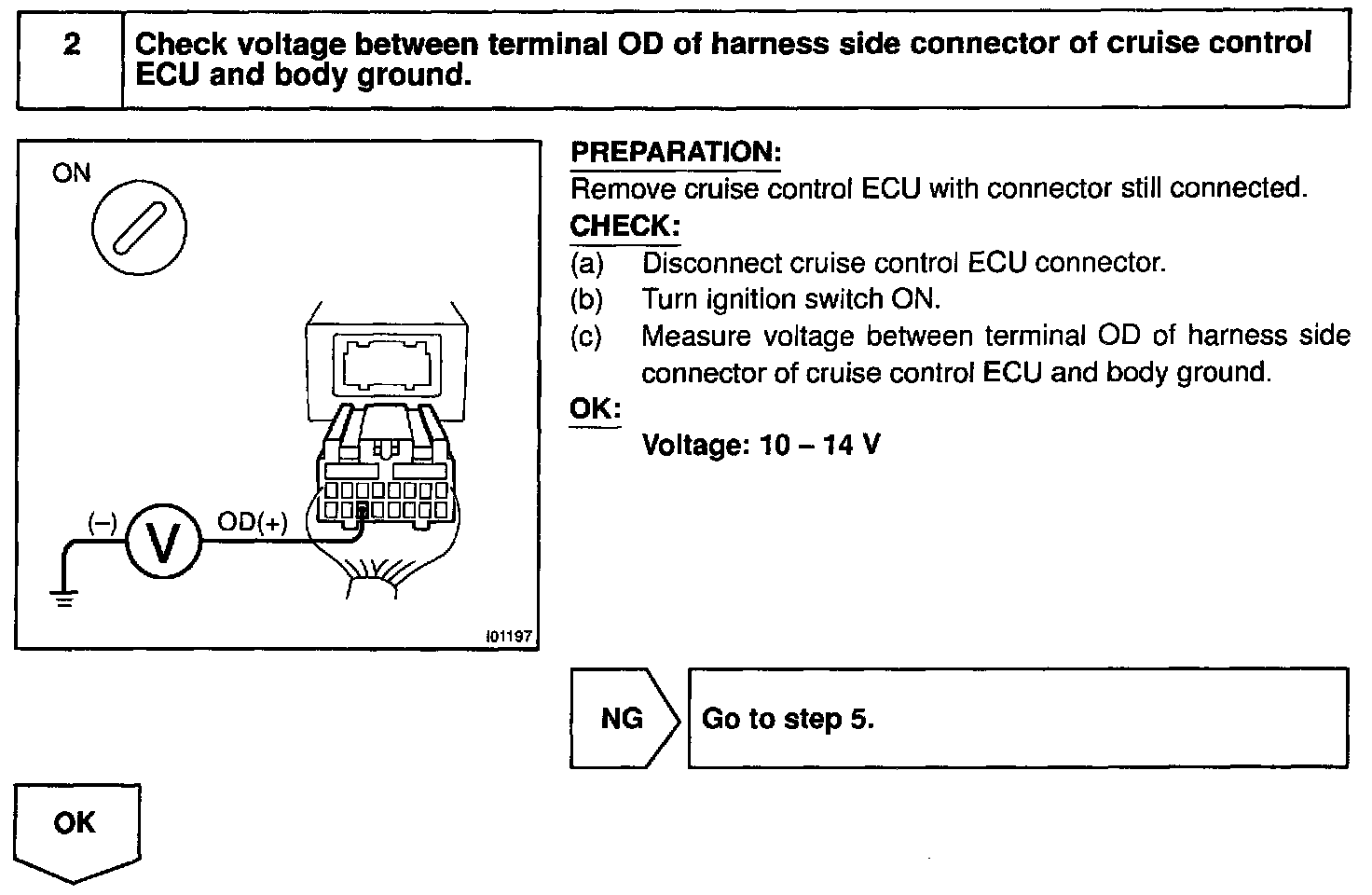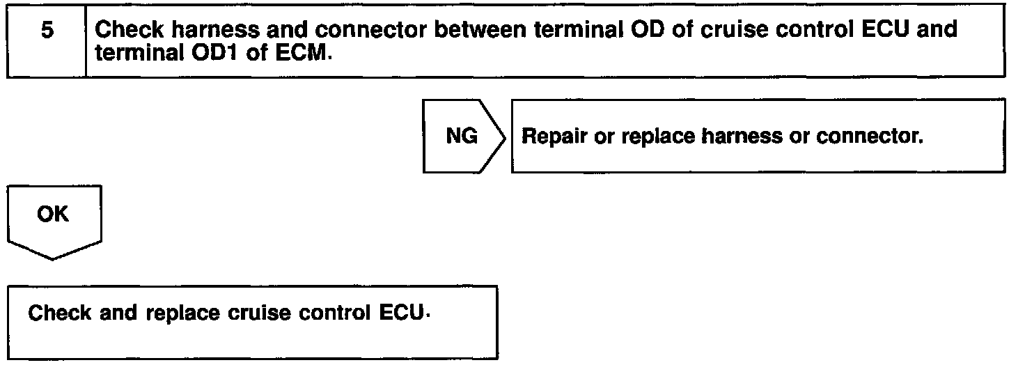 If vehicle speeds down, also when terminal electronically controlled transmission of the cruise control ECU receives down shifting signal, it sends a signal from terminal OD to ECM to cut overdrive until the end of the uphill slope, and the gear shifts are reduced and gear shift points in the electronically controlled transmission are changed.